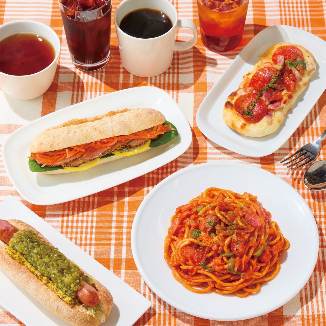 『カフェ・ベローチェ』では、ドリンクメニューはもちろん、ランチや軽食にうれしいフードメニューも充実しています。もっちり太麺の「ナポリタン」や、たっぷりのたらこが入った「大葉香るたらこバター」などのできたてパスタをはじめ、香ばしい全粒粉入りパンに具材を挟んで焼き上げる、人気の焼きたてドッグとサンド、もっちり食感のナンピザなど、種類豊富なフードメニューを取り揃えています。