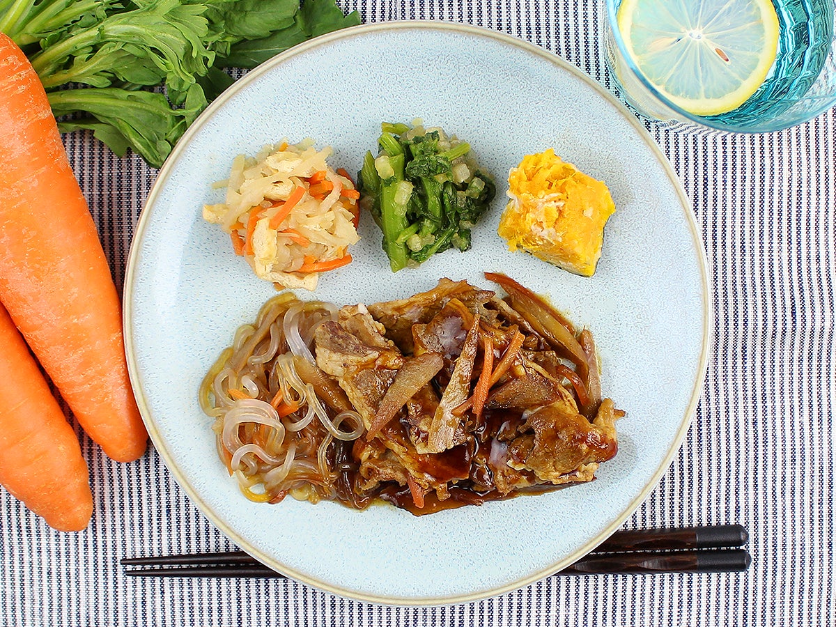 甘辛い醤油だれで仕上げた牛肉とごぼうの炒め煮です。牛肉の旨味と歯ごたえが特徴のごぼう、甘みのある人参、食感のよい糸こんにゃくを合わせ味わい深いおいしさが味わえます。