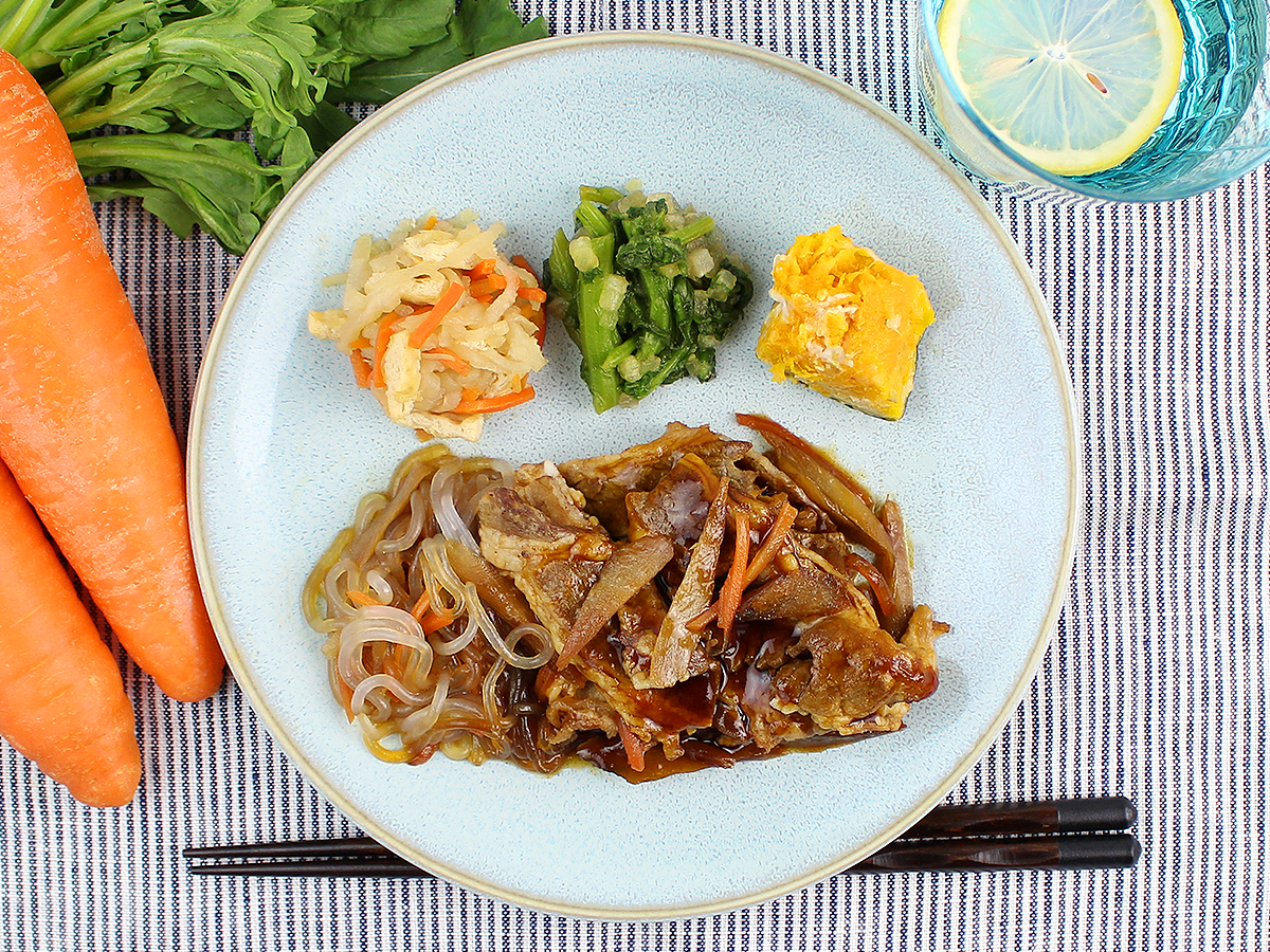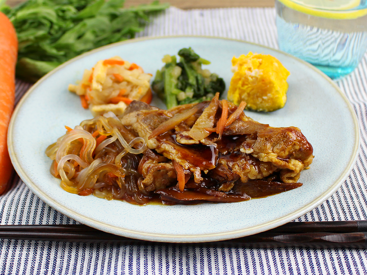 甘辛い醤油だれで仕上げた牛肉とごぼうの炒め煮です。牛肉の旨味と歯ごたえが特徴のごぼう、甘みのある人参、食感のよい糸こんにゃくを合わせ味わい深いおいしさが味わえます。