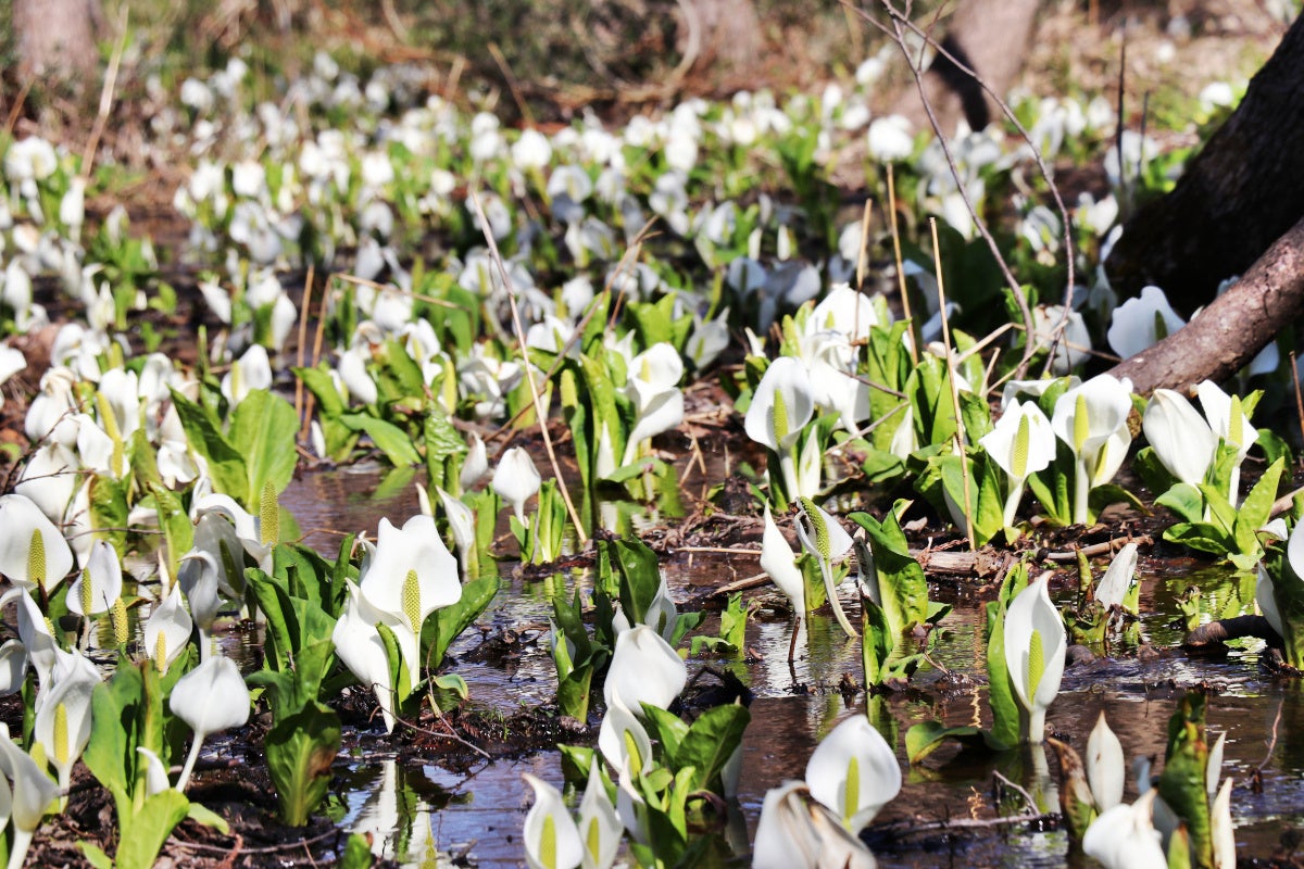 約8万株の水芭蕉郡が見られます。水芭蕉は、山間の湿地帯に生える植物で、春になると20~30cmの
