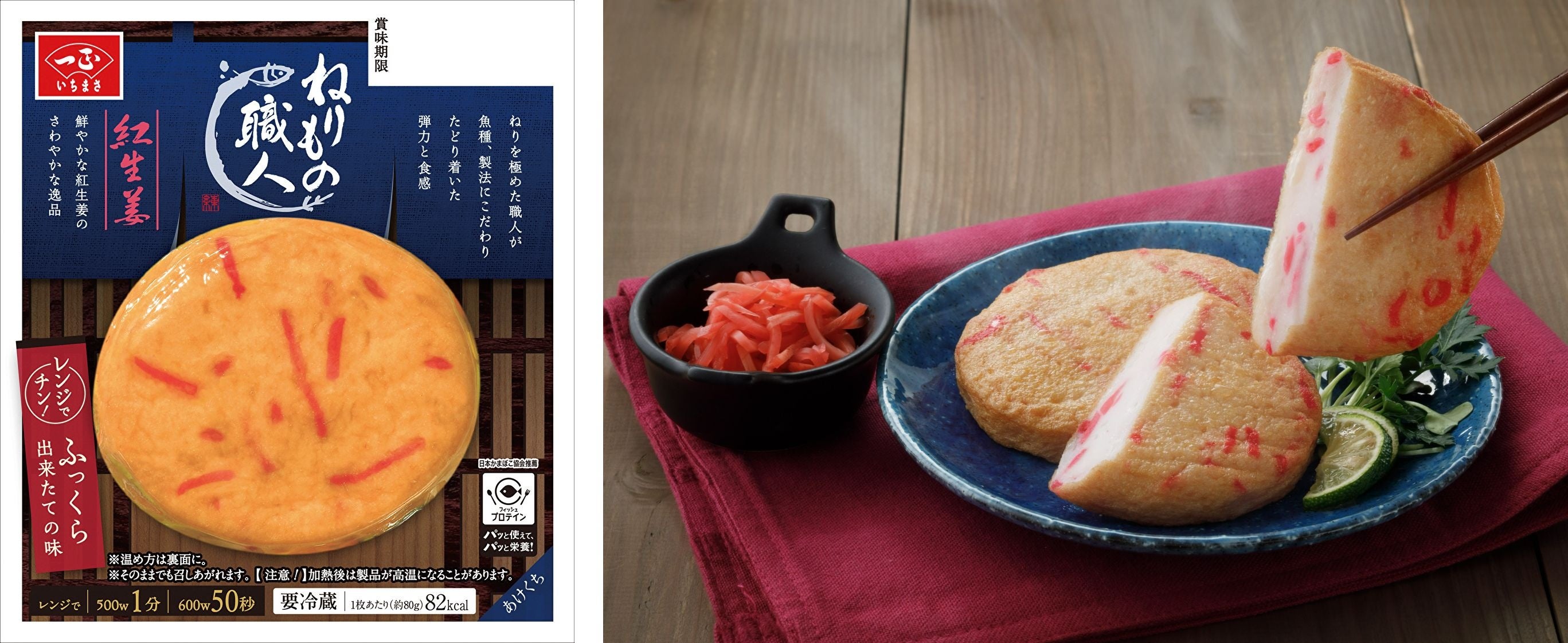 「ねりもの職人 てんぷら」は1枚約80gと食べ応えある大きさで、むっちりと弾力のある食感と魚の旨味を存分に味わうことができます。また「ねりもの職人 紅生姜」は食べた瞬間、紅生姜のさわやかな風味が口に広がり、むっちりしたさつま揚とシャキシャキした紅生姜の食感の違いも楽しむことができます。
