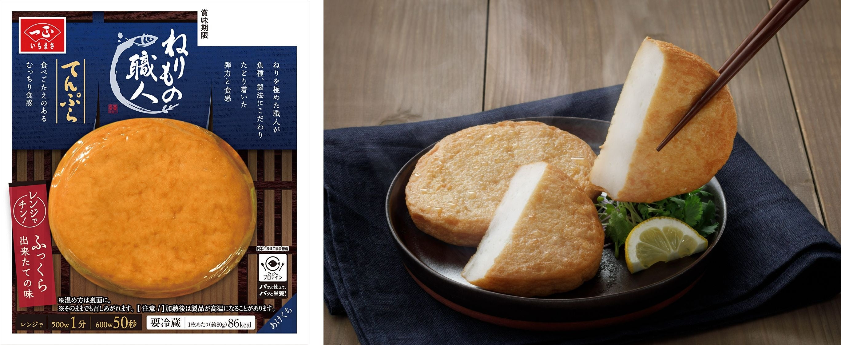 この商品の特長であるむっちりとした食感は、商品の特性・適性に合わせたすり身原料の選定、弾力を生み出すための摺潰(ねりこみ)手法の調整などがポイントで、水産練り製品製造技能士の資格を持つ、いちまさの職人たちの知識や技術を結集し開発しました。 また、魚由来の良質なタンパク質を気軽に摂取することができるフィッシュプロテインマーク表記の商品であり、健康を気にされる方にもおすすめです。