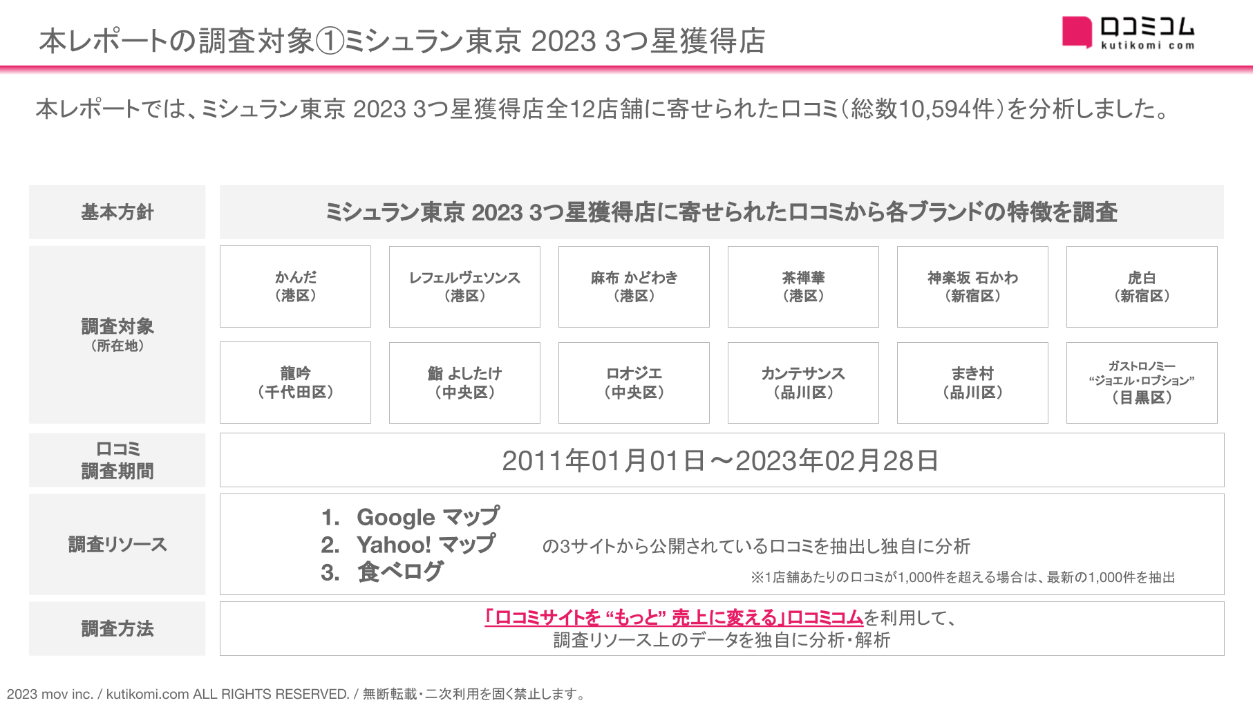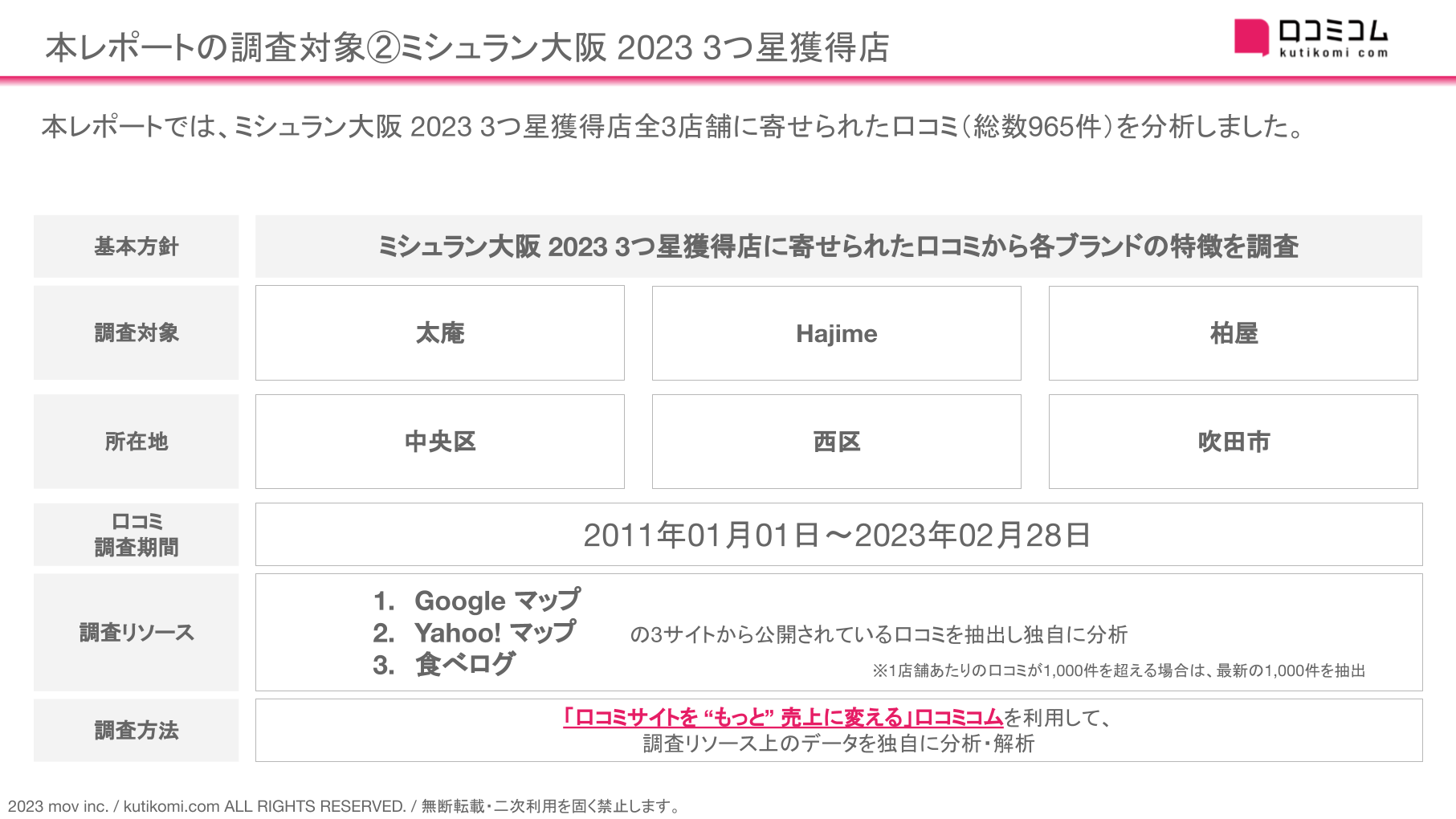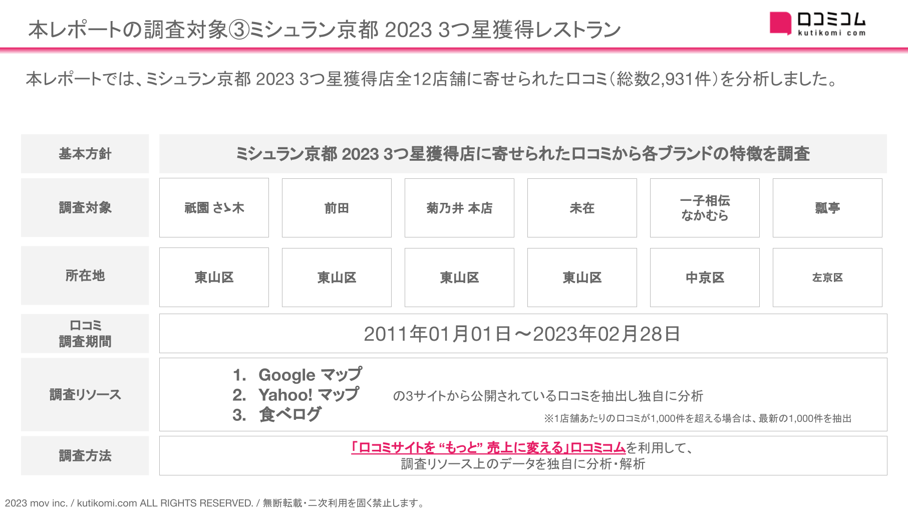 本レポートでは、ミシュラン2023 東京・大阪 ・京都 3つ星獲得店全21店舗に寄せられた口コミ(総数14,490件)を分析しました。