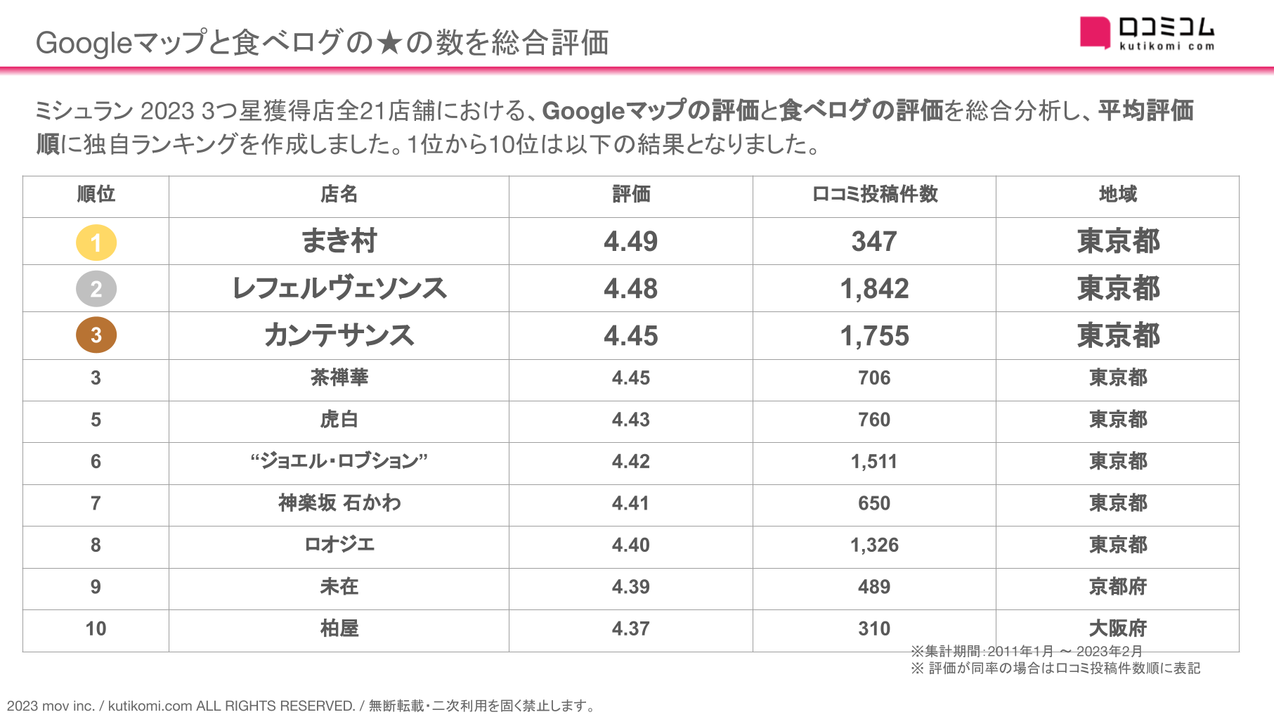 ミシュラン 2023 3つ星獲得店全21店舗における、Googleマップの評価