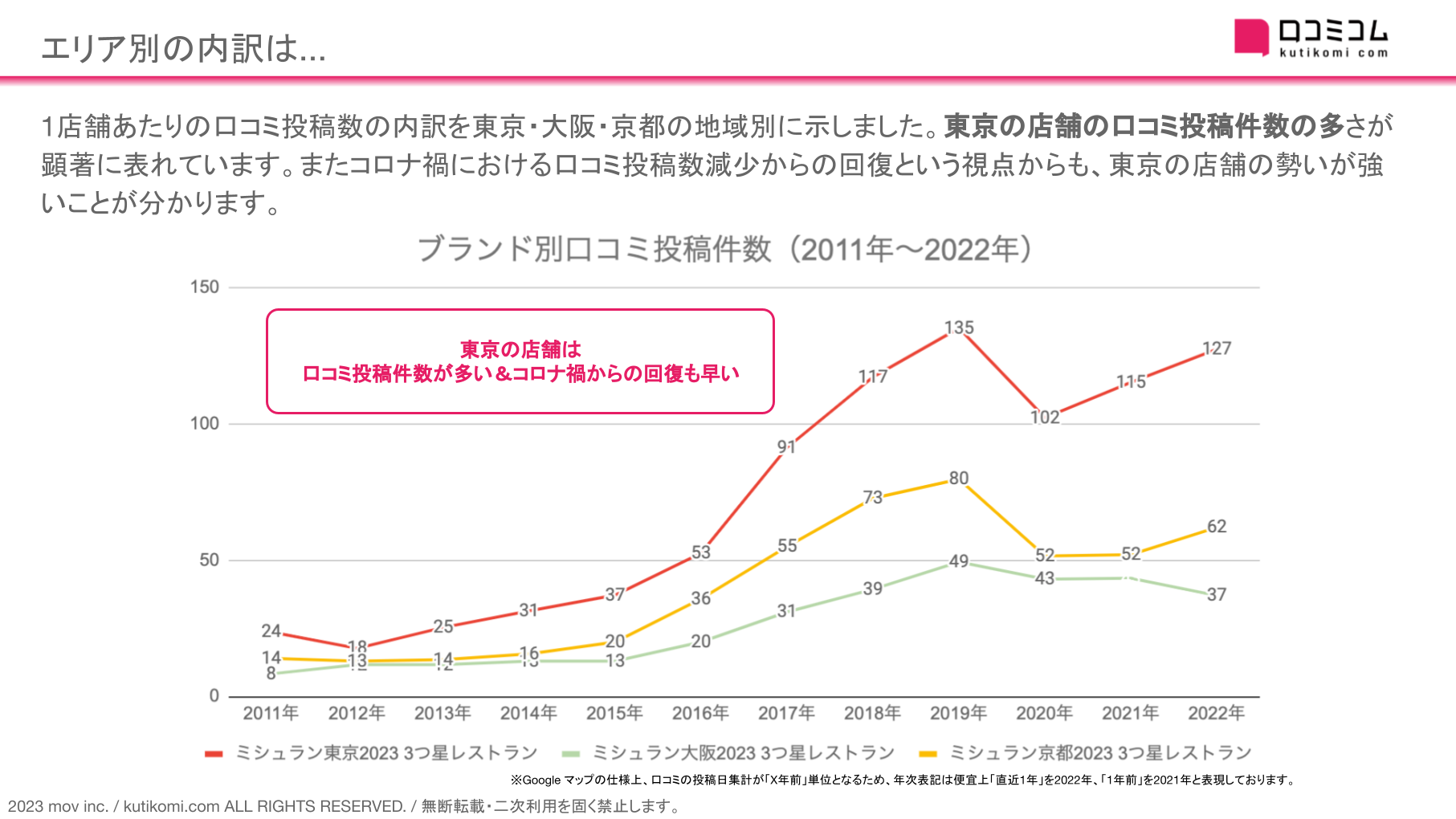 が顕著に表れています。またコロナ禍における口コミ投稿数減少からの回復という視点からも、東京の店舗の勢いが強いことが分かります。
