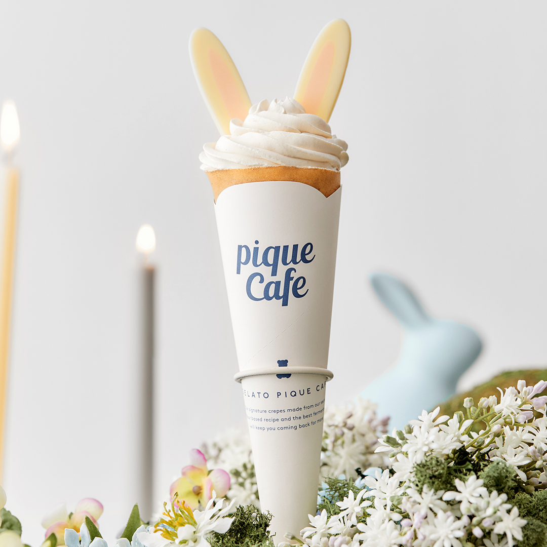 バニラジェラートの上に、たっぷりのホイップクリームを絞り、ホワイトチョコレートで作ったウサギの耳をトッピング。クレープの中には、濃厚なチーズケーキ、チーズクリーム、蜂蜜を合わせ、コクのあるリッチな味わいに仕上げました。アクセントの生チョコとアーモンドクッキーが、よりクレープの味わいを引き立てます。イースターのお祝いにぴったりな、贅沢な味わいのクレープです。