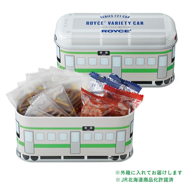 札沼線(学園都市線)を走る721系電車を描いた缶に、人気のピュアチョコレートとロイズアールショコラ2種類を詰め合わせました。