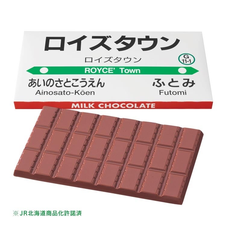 ロイズタウン駅の駅名標をデザインしたパッケージに、ミルクチョコレートのコクとまろやかさをお楽しみいただける特大サイズの板チョコレートを入れました。