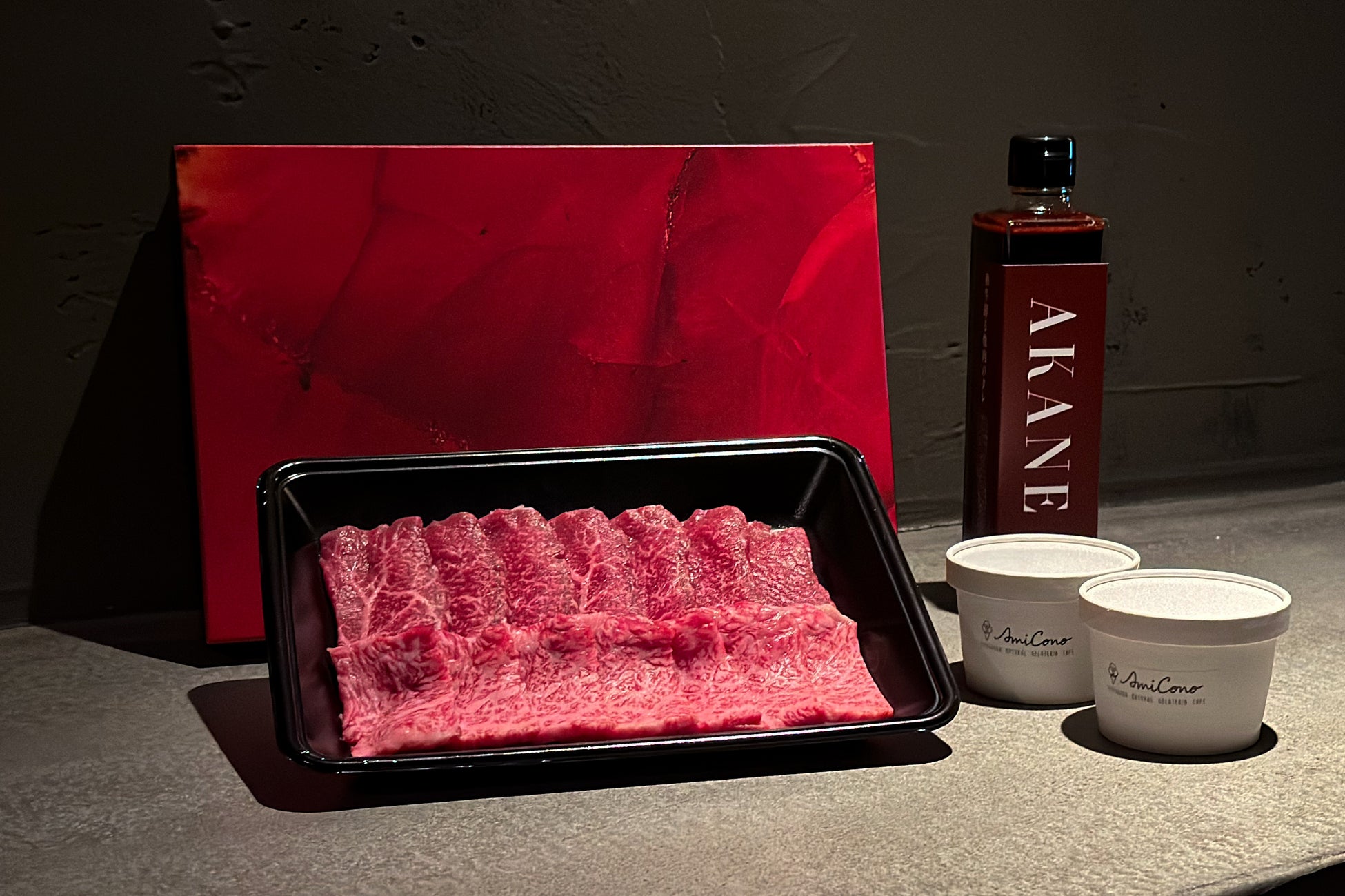 【内容】 A5ランクオリーブ牛赤身焼肉200g/A5ランクオリーブ牛ロース焼肉200g/「和牛弾む焼肉のタレAKA」もしくは「和牛躍る焼肉のタレAKANE」1本/ AmiConoオリーブジェラート2カップ