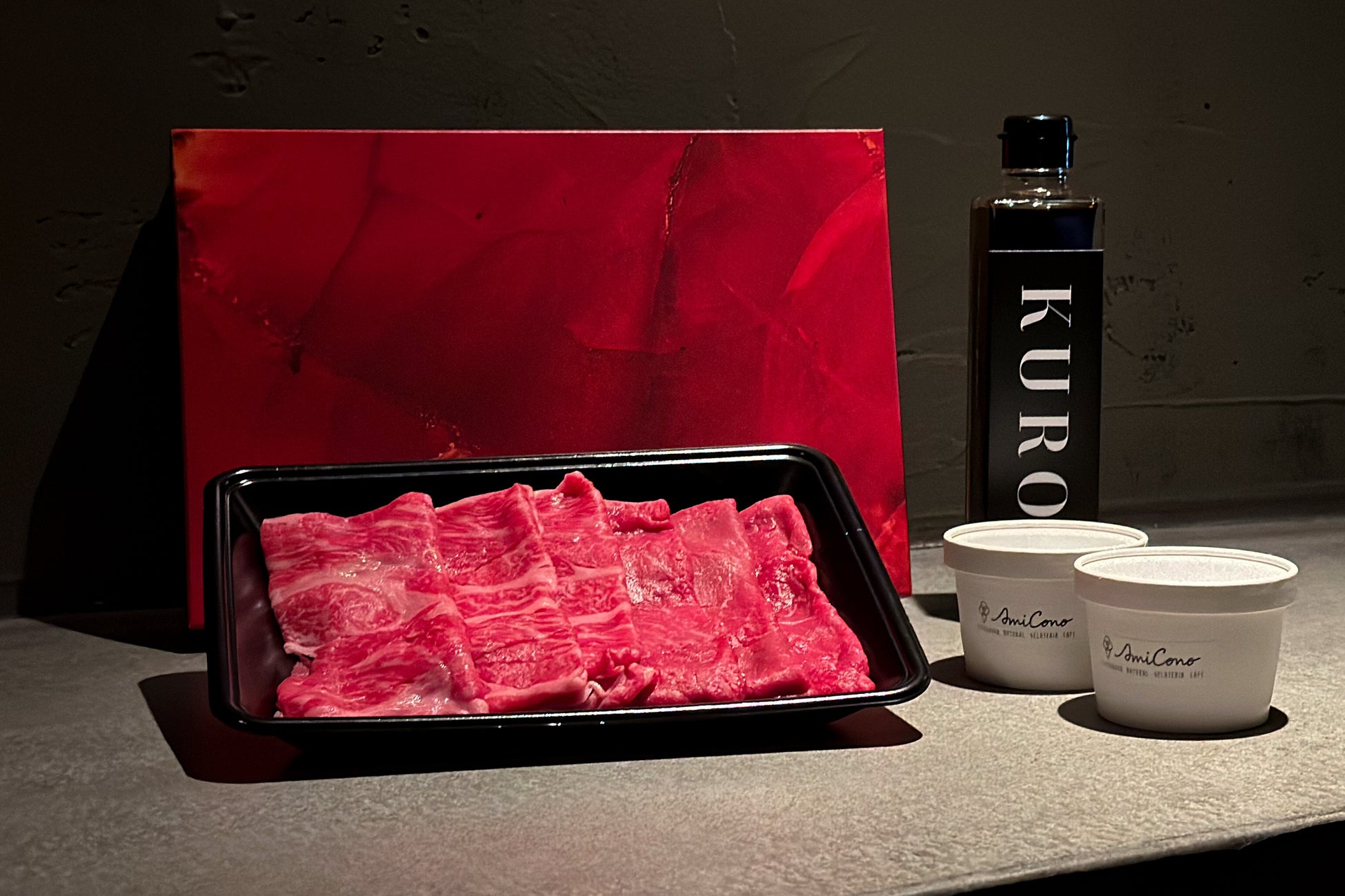 【内容】 A5ランクオリーブ牛ももスライス200g/A5ランクオリーブ牛肩スライス200g/「和牛艶めくすき焼き割り下KURO」1本/ AmiConoオリーブジェラート2カップ