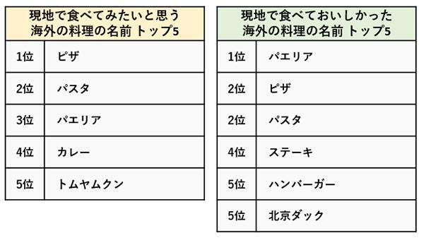 一方、現地で食べておいしかった料理としては、ピザを抜いて、スペイン料理の「パエリア」が1位になりました。2位は「ピザ」「パスタ」、そして4位には「ステーキ」、5位には「ハンバーガー」「北京ダック」が入っています。