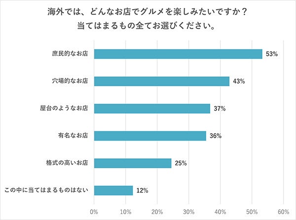 1位は「庶民的なお店」(53%)でした。一方で「格式の高いお店」は25%と、低めの数字となっています。海外ならではの雰囲気を味わうために、その地域の人たちが日常的に訪れる庶民的なお店にこそ入ってみたいと思う方が多いのかもしれません。