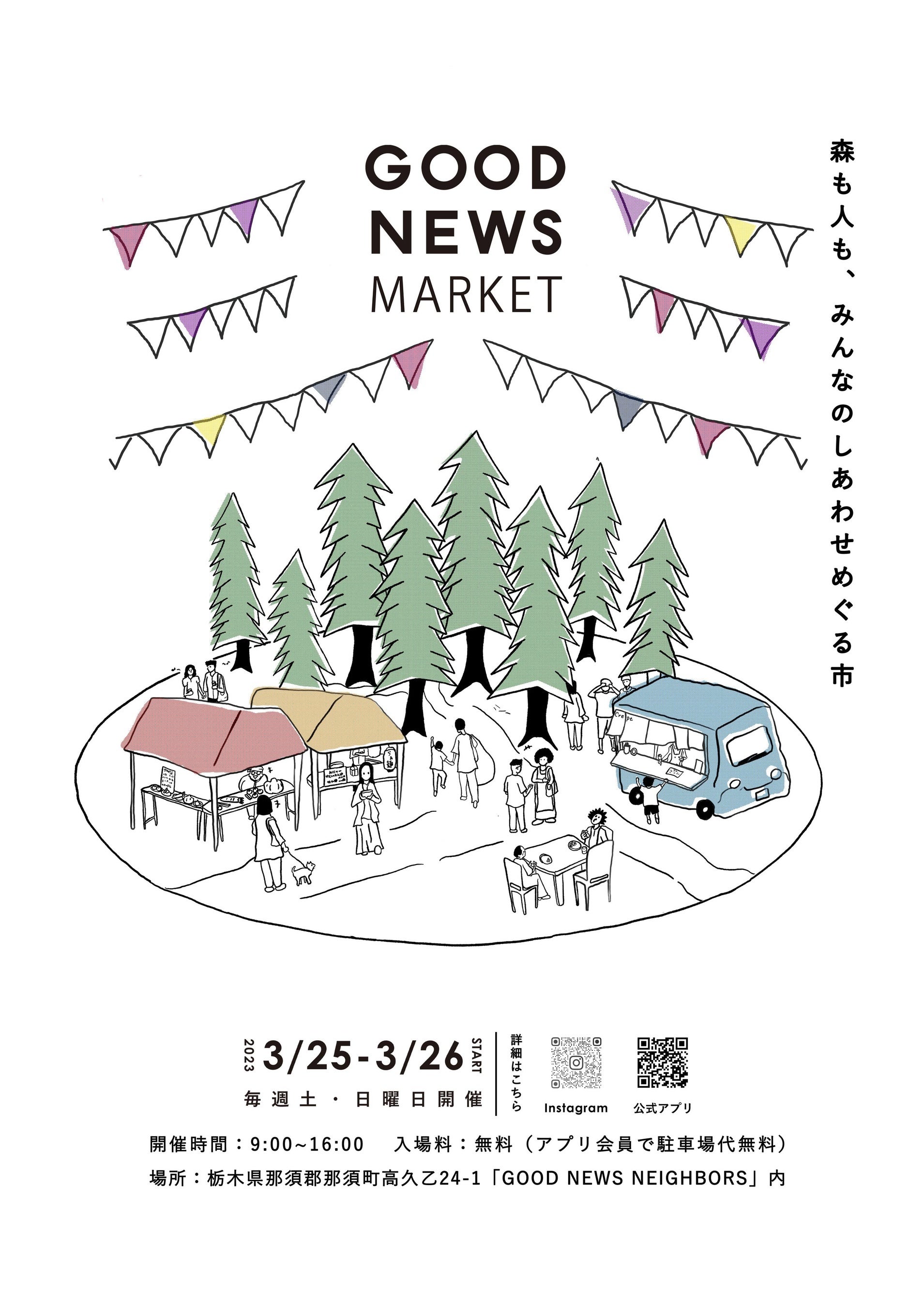 栃木県・那須生まれの新銘菓「バターのいとこ」など、食をテーマに社会課題を解決することを目的とした会社「株式会社GOOD NEWS」(所在地:栃木県那須町、代表取締役:宮本吾一)」が運営する、森と人とが共生する持続可能なまち『GOOD NEWS(グッドニュース)』。その自然豊かな環境を生かしたイベント「GOOD NEWS MARKET(グッドニュースマーケット)」の開催が決定致しました。2023年3月25日(土)26日(日)を皮切りに、毎週土日に開催予定。「大きな食卓」をテーマに地域の生産者や栃木県内外の飲食店が集結し、食を通じて地元の方や観光客の方をはじめ、多様な背景をもつ人が交流を持てるような空間を作り上げていきます。さらにイベントでは提供する食器やドリンクカップにリユースできるものを取り入れたり、エコバッグの利用を推奨するなど環境に配慮した取り組みにもチャレンジし、開催を重ねるごとにゴミを減らすことを目標としていきます。