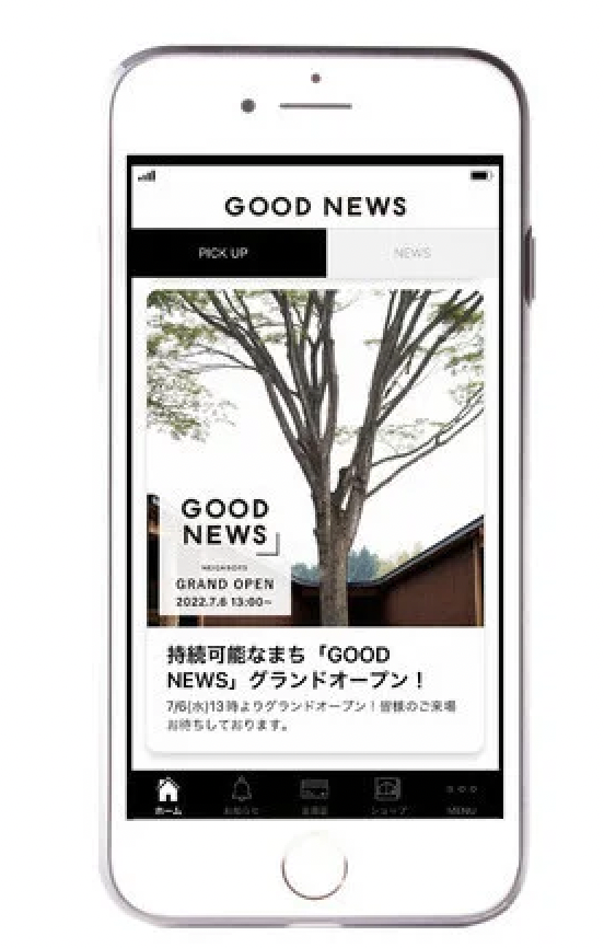 栃木県・那須に誕生した新たなまち「GOOD NEWS」に関する最新情報や、施設の取り組みなどを発信するGOOD NEWSの公式アプリ。アプリ会員登録で、店頭でのお買い物毎に1%のサステナブルポイントが貯まります。貯まったポイントは、GOOD NEWSで取り組むサステナブルアクションに運用させていただくことで、ご来場の皆様の日々のお買い物を「持続可能なまちづくり」に繋げていきたいと考えております。また、通常500円かかるGOOD NEWS施設の駐車場が無料になる特典もご用意。