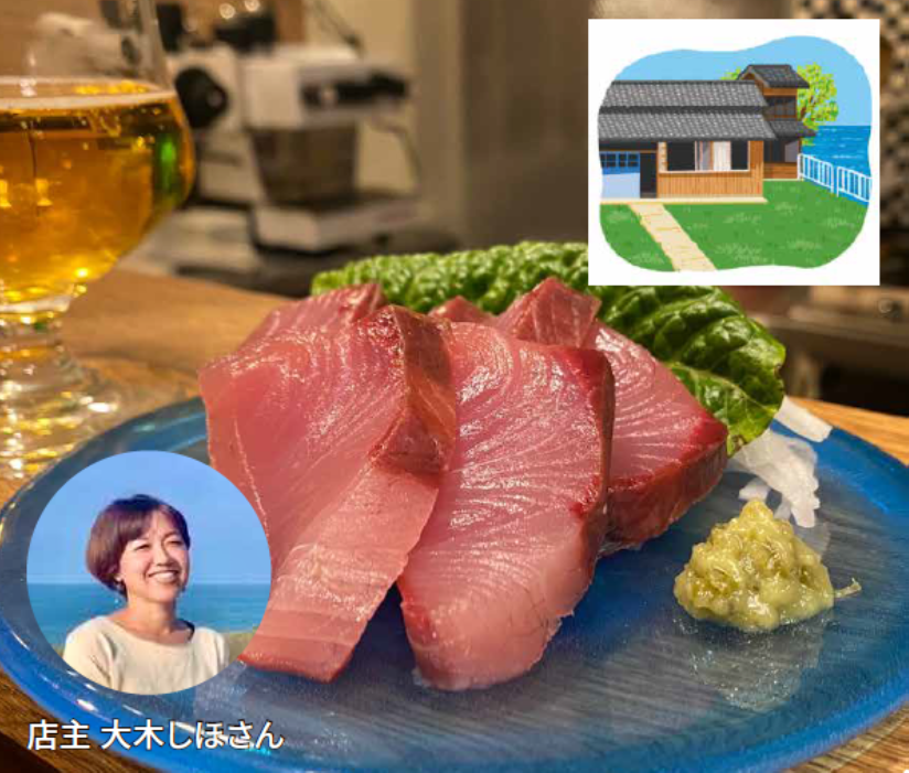 松屋町「酒菜の大きに」を一時休業し、自身の出身地である京丹後・間人でお店をオープンした大木しほさん。現地でしか味わえない京丹後の魅力を伝えながら、ジャンルにこだわらず、観光案内所の役目も果たせたら、という想いを胸にお店を開始。今回はこだわりの魚を販売する「畑中鮮魚」と共同で出店。