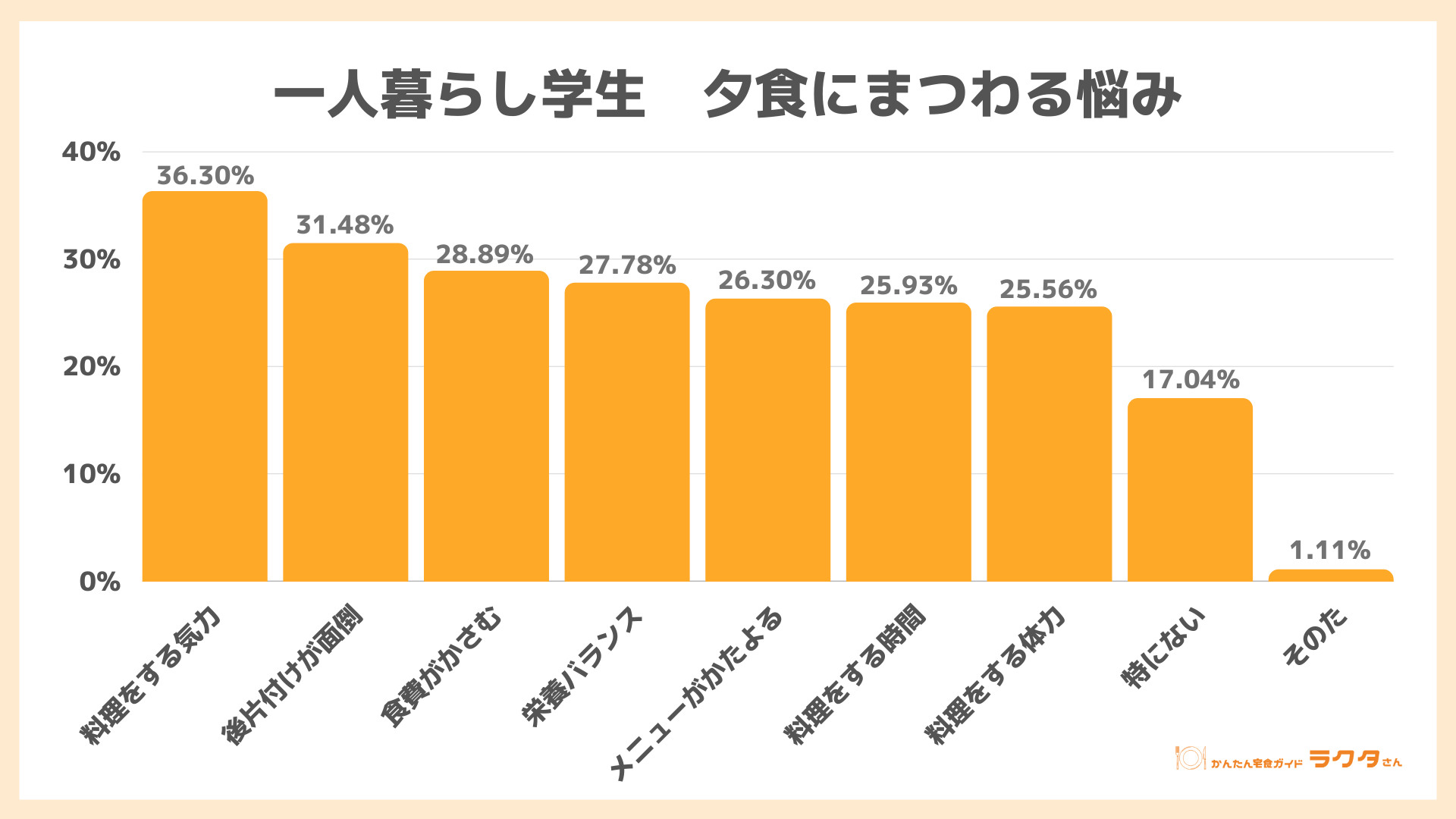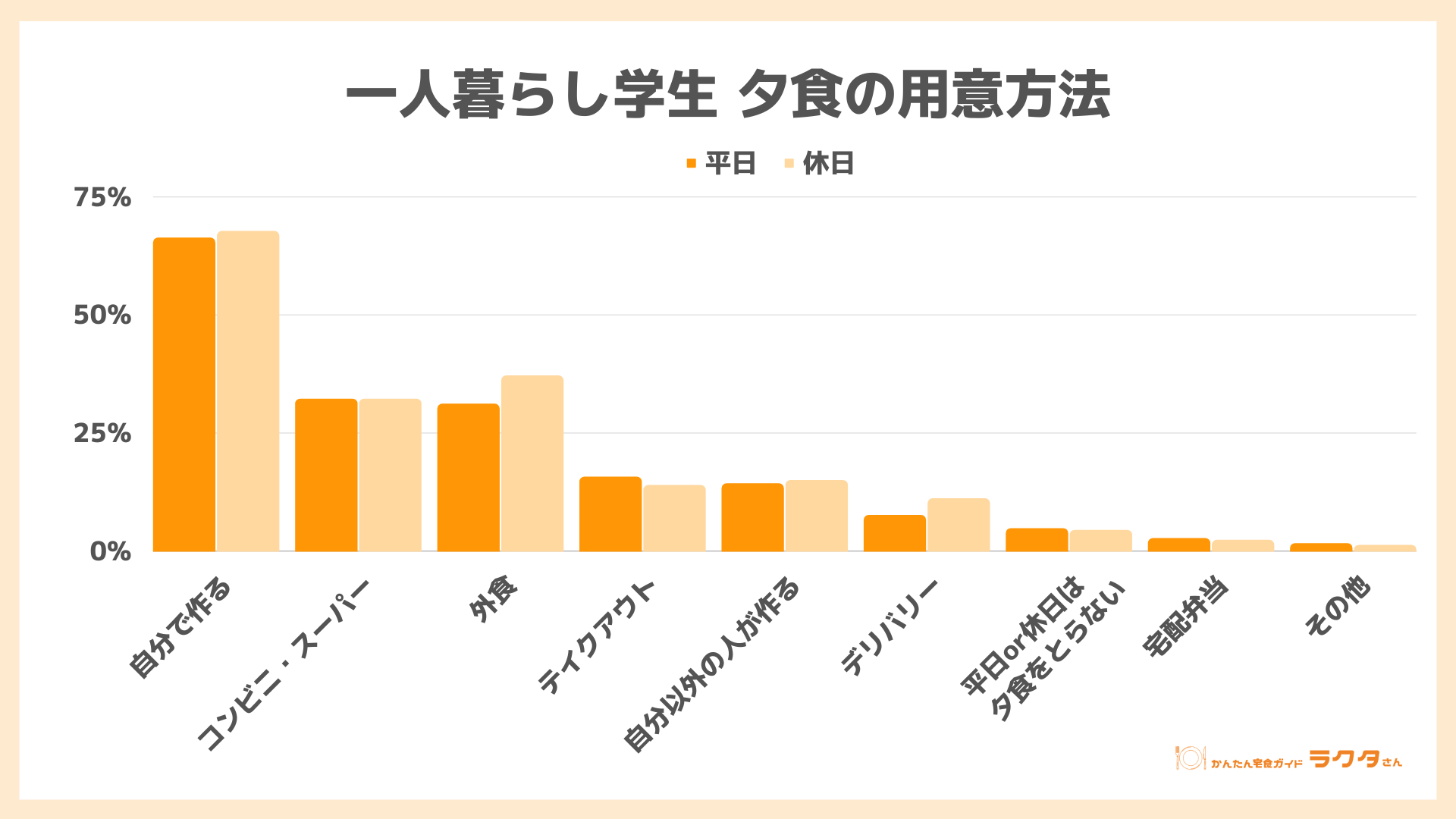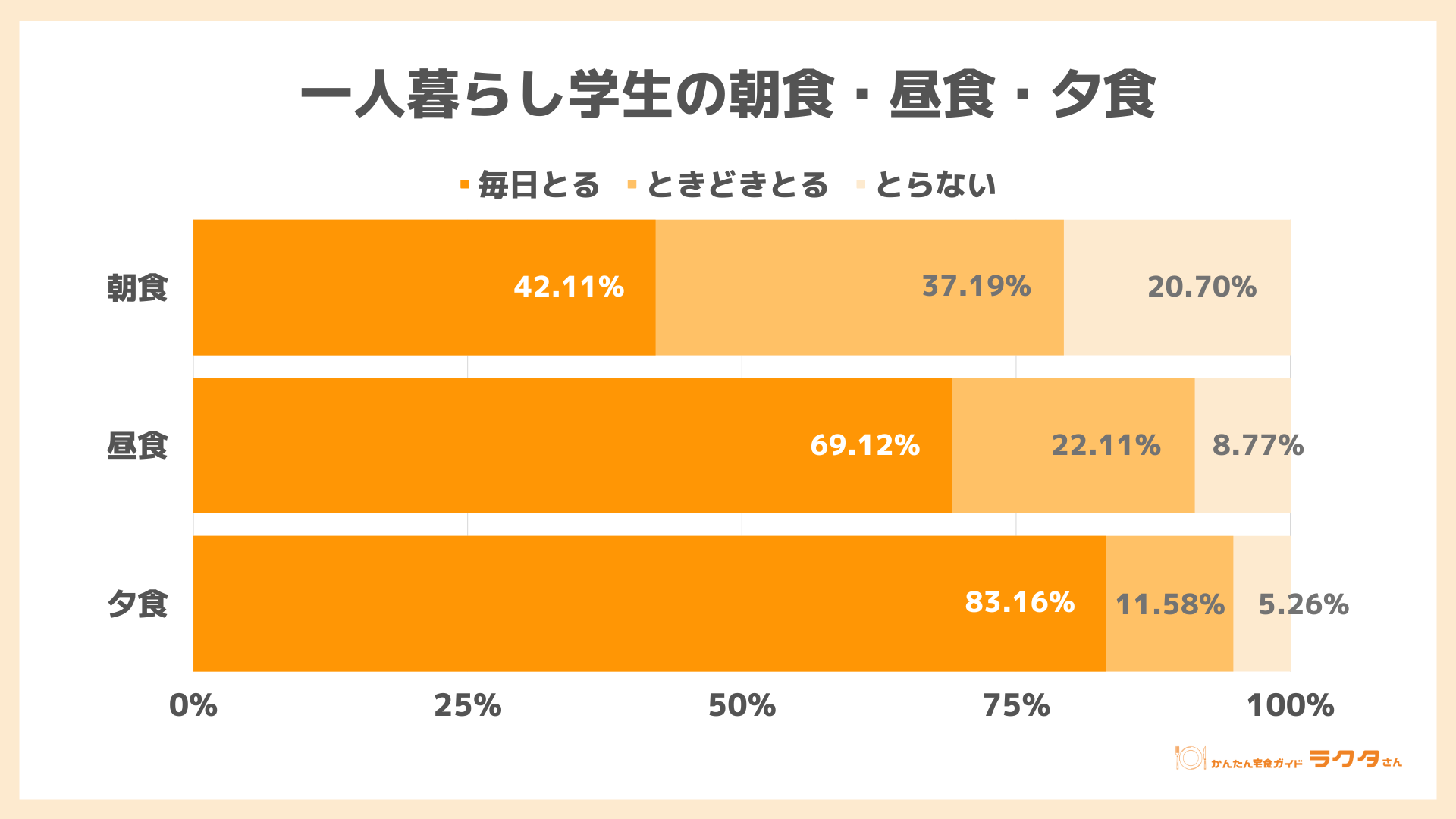ナイル株式会社(本社:東京都品川区、 代表取締役社長:高橋飛翔、 以下ナイル)が運営する「かんたん宅食ガイド ラクタさん」にて、2023年3月7日~3月14日の期間中、一人暮らしの20代・学生男女285人を対象に食事に関するアンケート調査を実施しました。