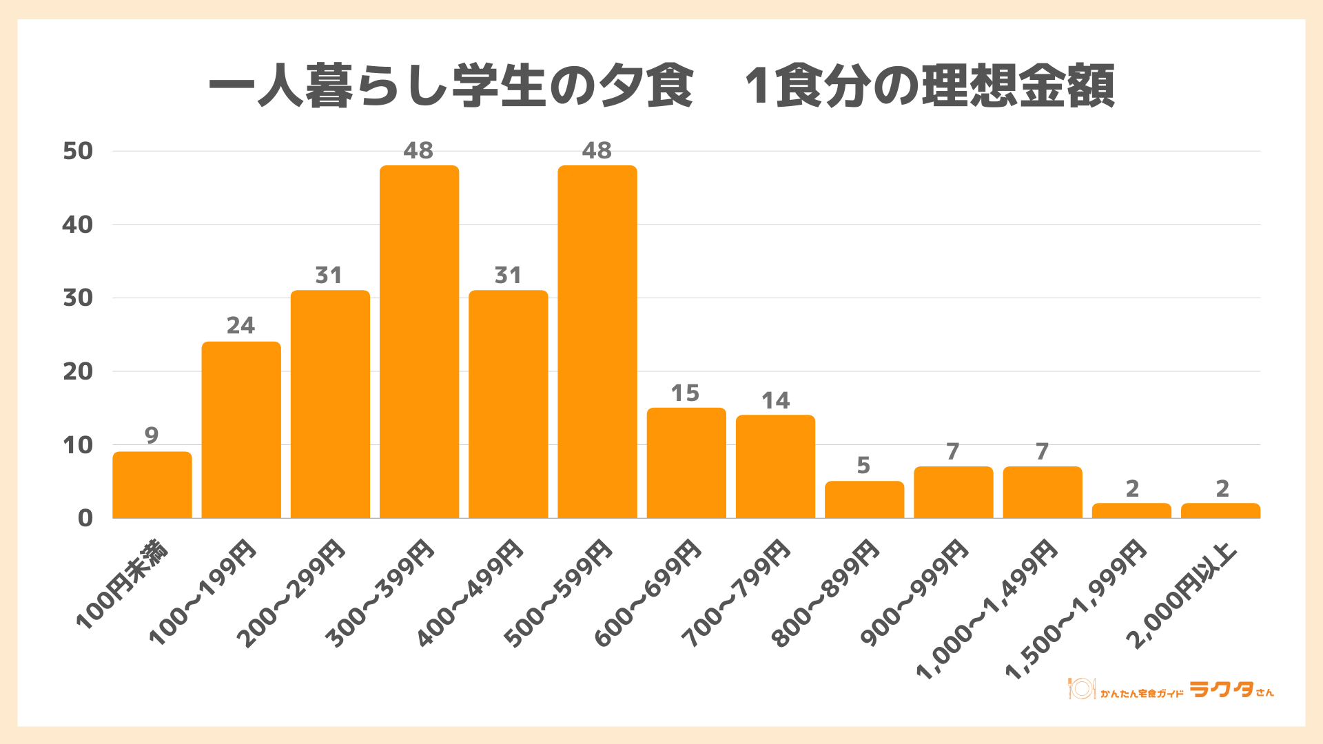 夕食1食分の理想金額は、「300〜399円」と「500〜599円」が最多でした。599円以下に回答が集中しており、全体の7割を占めています。