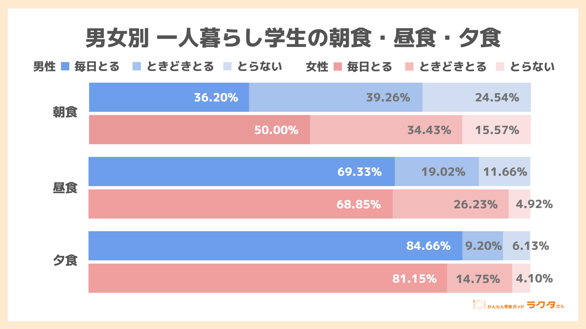 男女別で見ると、朝食は「毎日とる」が女性50.00%に対して、男性は36.20%。男性の方が朝食を抜いている人が多いです。