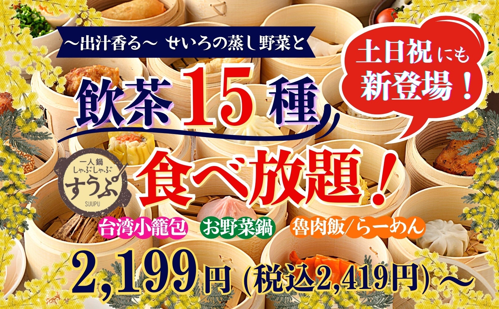 食べ放題のテーマパーク、 ニラックス株式会社(本社:東京都武蔵野市、 代表取締役:崎田 晴義)が運営する「台湾飲茶と一人鍋しゃぶしゃぶ すうぷ 静岡パルコ店』で大人気の『飲茶食べ放題』コースが、土日祝にも登場いたします!