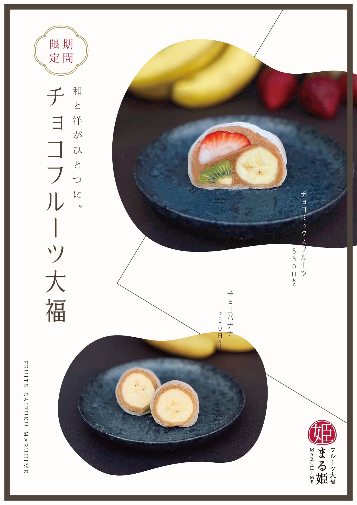 ●チョコミックスフルーツ ¥680(税込)・・・まる姫の中でも特に人気の高いフルーツミックスをチョコレート大福で作りました。中に包むフルーツもチョコレートとの相性の高いイチゴ・キウイ・バナナに変更!色々なフルーツとカカオの香りが口の中に広がります