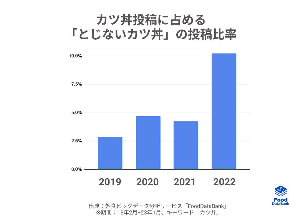 実際に各年のカツ丼投稿に占める「とじないカツ丼」の投稿比率に着目してみると2022年に伸長していることが分かります。