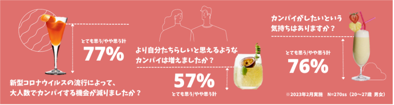 20歳~27歳の男女270名に対して「お酒や飲み会に関する調査※2」を実施したところ「新型コロナウイルスの流行によって、大人数(20名以上)でカンパイする機会が減ったと思う:77%」「大人数でカンパイする機会は減ったが、より自分たちらしいと思えるカンパイのシーンは増えたと思う:57%」「カンパイがしたいという気持ちはある:76%」などの結果が得られました。これらのデータからZ世代が”カンパイロス”に直面した一方で「自分たちらしいお酒の楽しみ方を求める気持ち」があることが分かりました。