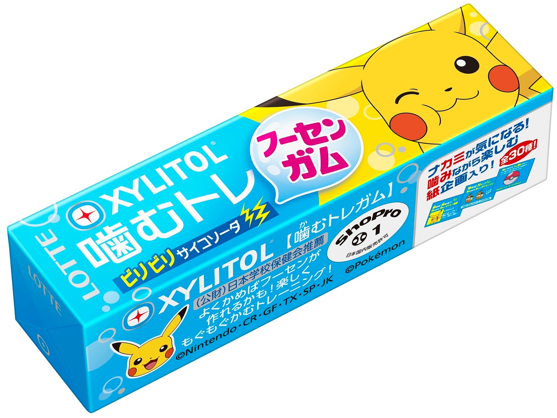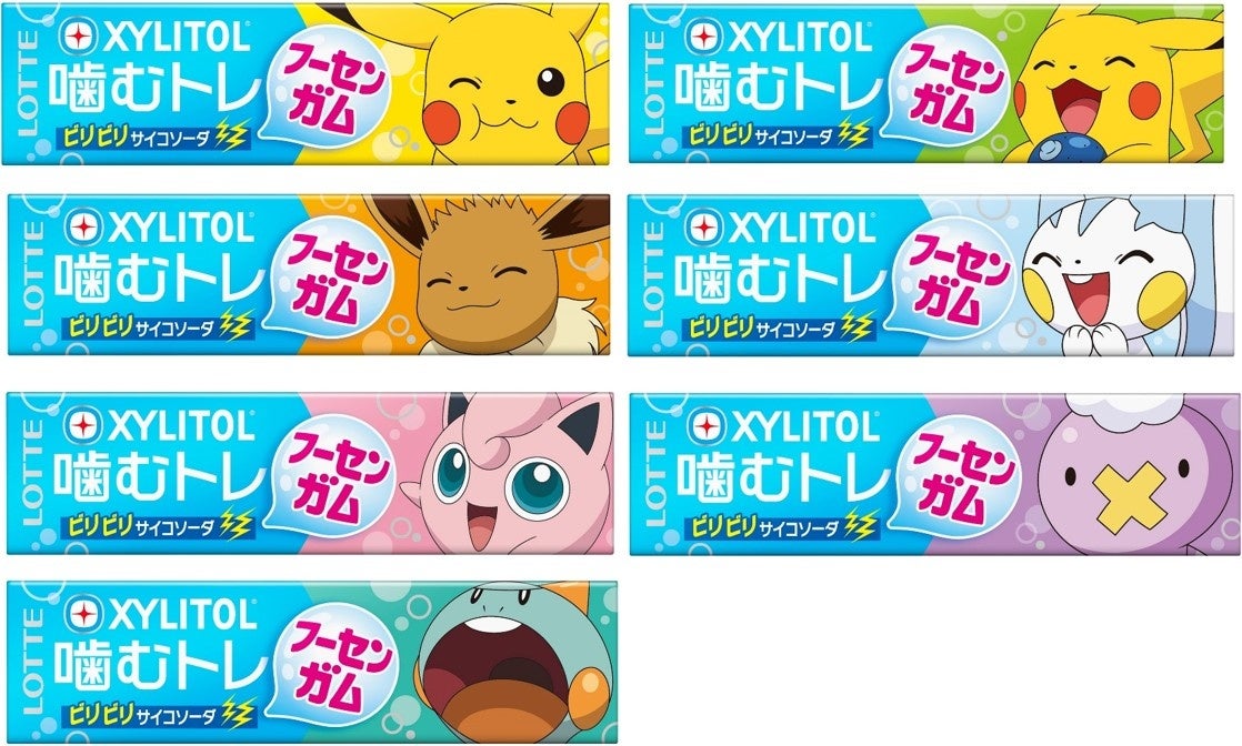 かわいいパッケージは全部で7種類!ピカチュウ、イーブイ、パチリス、カムカメにプリン、フワンテが仲間入り。一緒に楽しく噛もう!
