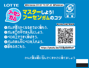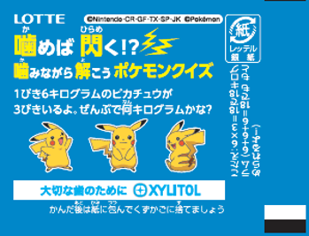 「噛めば読める!?噛みながら読もうポケモン図鑑」(全9種)、「噛めば閃く!?噛みながら解こうポケモンクイズ」(全19種)、「身につけようガム噛みマナー」(1種)、「マスターしよう、フーセンガムのコツ」(1種)の全30種。ガムを噛みながら、レッテルでも遊んでみよう!