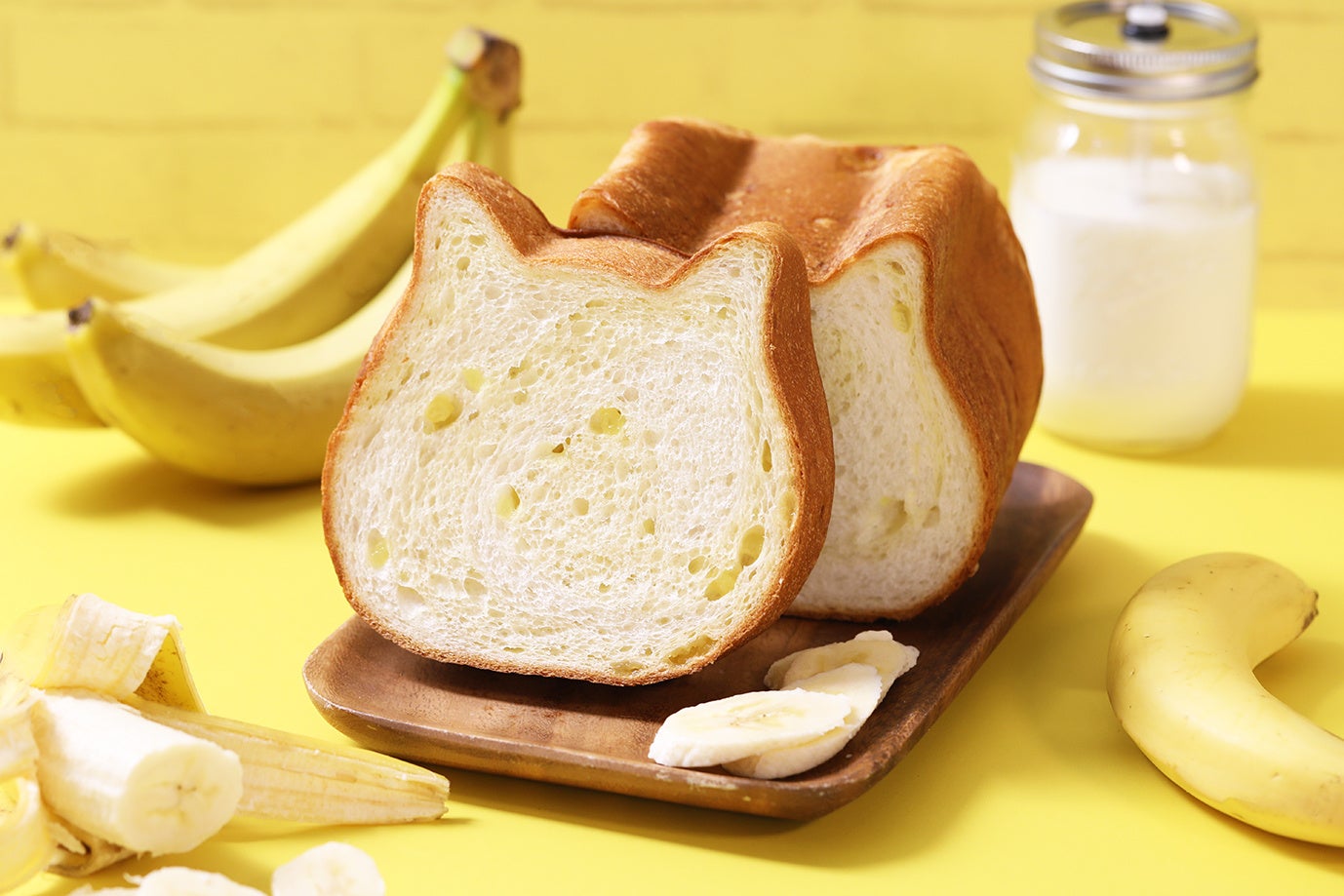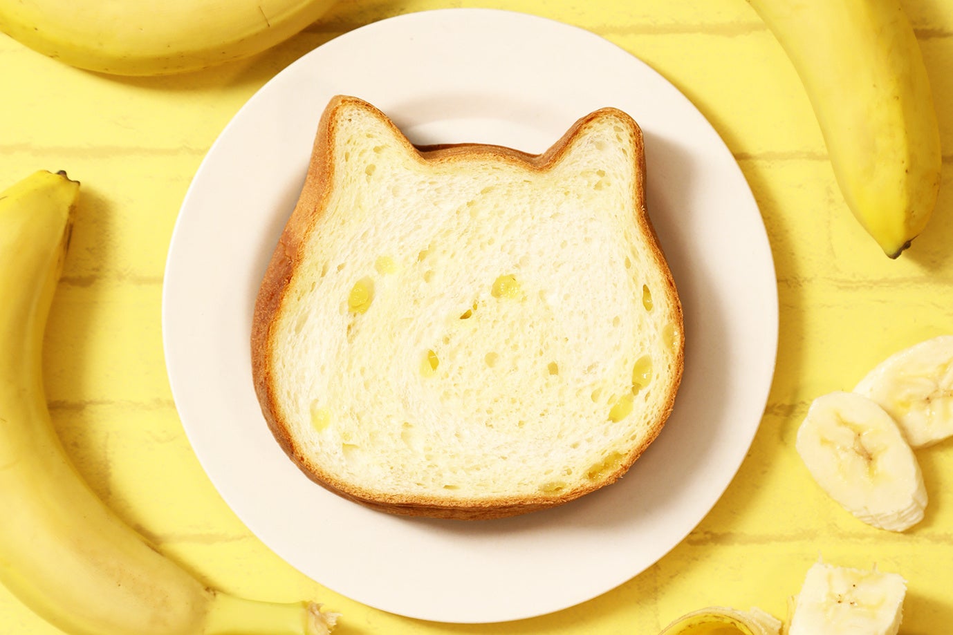 4月のオンラインストア限定ねこねこ食パンは、一足早く初夏を感じられるトロピカルな”バナナみるく”フレーバーをご用意いたしました。ねこねこ食パン特有のミルク100%の生地とバナナのつぶジャムを巻き込んだバナナ風味の生地で仕上げ、口の中でまろやかにとろけるバナナみるくを再現いたしました。ミルキーでバナナの甘みが感じられるおいしさと、可愛いねこの形の食パンで日々の食卓にを癒しを提供いたします。