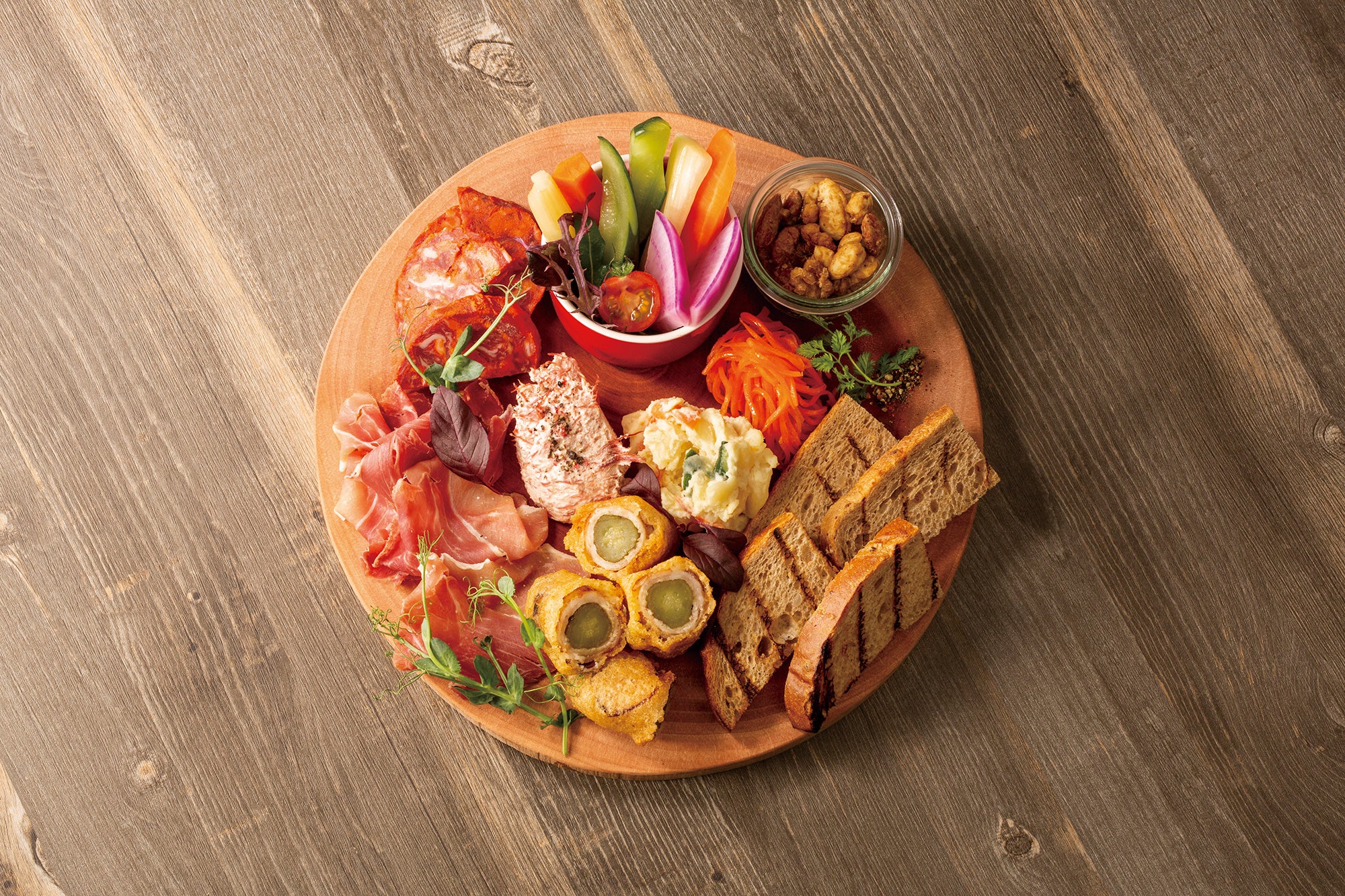 デリサラダ 湘南ゴールドドレッシング、自家製スモーク盛り合わせ、ベーコン チキン ナッツのスモークピザ、黒ビールでマリネしたチキンの半身ロースト、清水屋ケチャップのナポリタン
