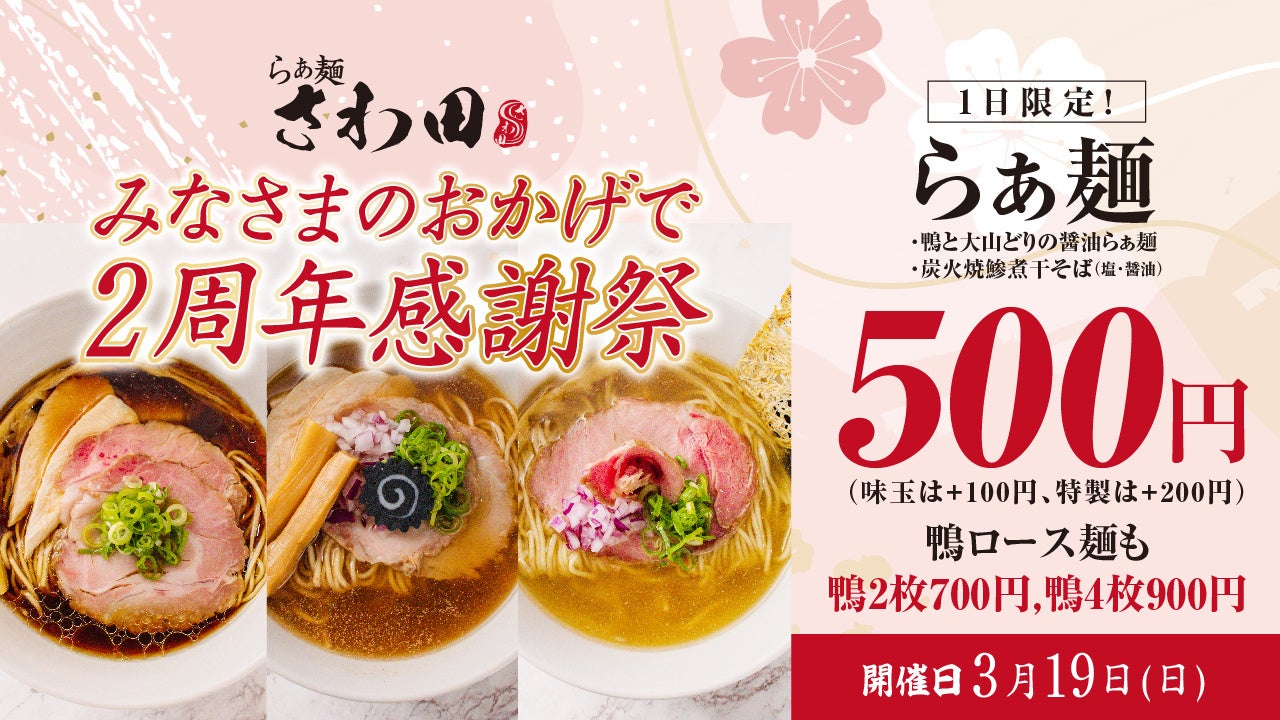 東京・吉祥寺の『らぁ麺 さわ田』はおかげさまで2周年を迎えます。コロナ禍でのオープンから今日までを支えてくださったお客様へ感謝を込めて、創業日である3月19日(日)限定の特別価格をご用意いたしました。
