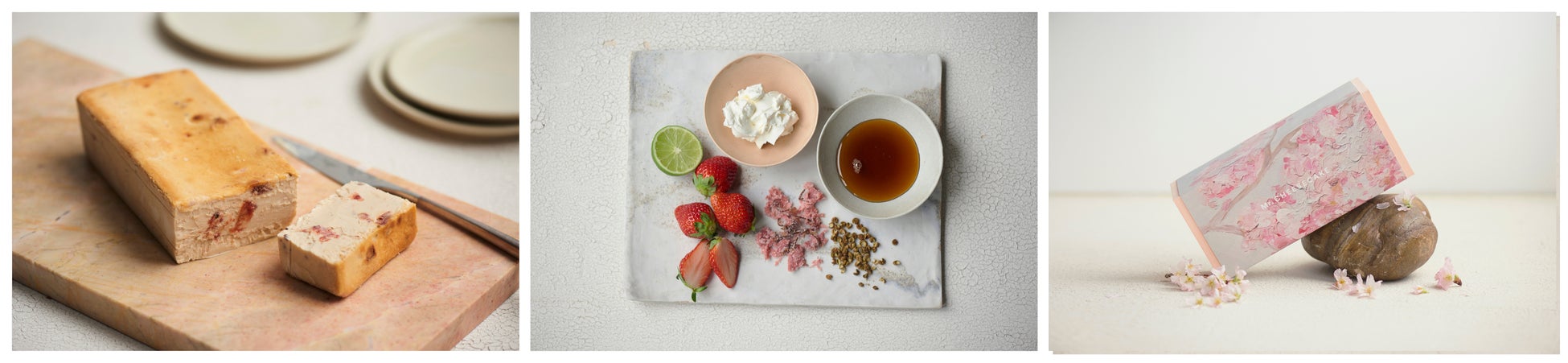 いちごの濃厚な味わいに山椒とライム果汁を加え、フレッシュな香りを表現。桜といちごのコンフィチュールを生地に合わせることで、噛んだときに弾けるいちごの甘味と酸味、桜の塩気と香りを楽しめるチーズケーキです。練乳やスキムミルクでまろやかさが加わったいちごミルクのような懐かしい味わいをお楽しみください。