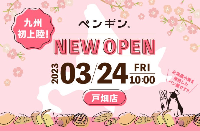 全国へ積極的にフランチャイズ展開している株式会社ペンギン(本社:北海道札幌市、代表:高山 英之)が運営する「ペンギンベーカリー」は、この春ついに、九州に初上陸。32店舗目となる「ペンギンベーカリー戸畑店」を福岡県北九州市にオープンします。北海道小麦をつかって焼き上げたパンをたくさんご用意して、みなさまのご来店をお待ちしております。