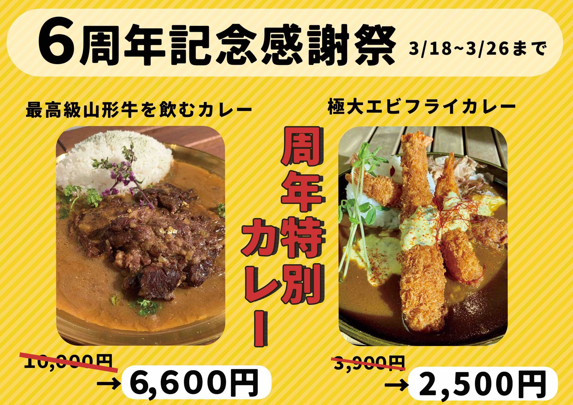 6周年を記念した特別メニュー「最高級山形牛を飲むカレー」&「極大エビフライカレー」を提供します。