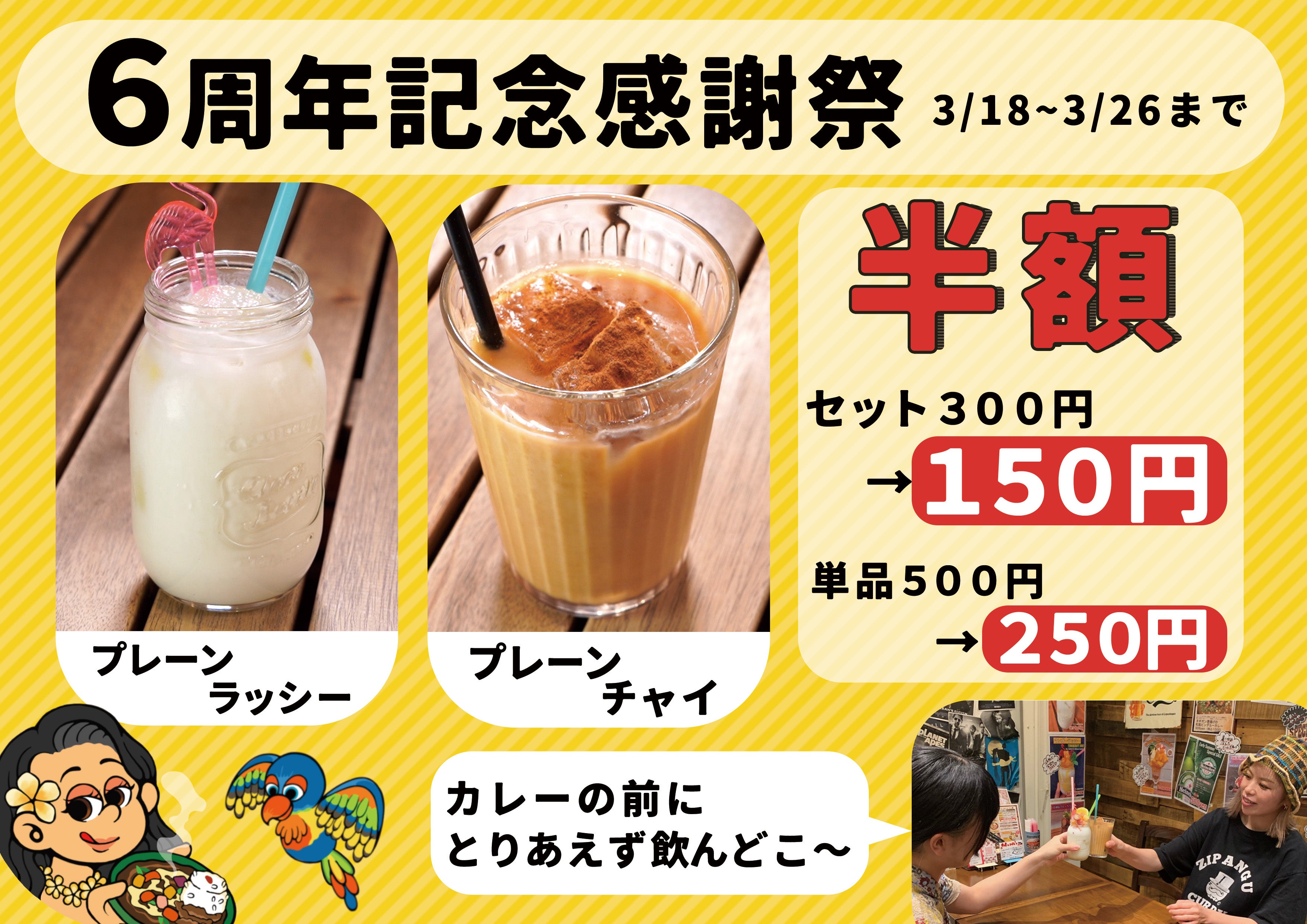 ジパング定番の焼きチーズトッピングや名物ラッシー&チャイが周年特別価格!