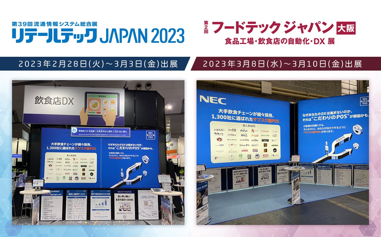 日本電気株式会社(本社: 東京都港区、代表取締役執行役員社長 兼 CEO 森田 隆之、以下NEC)は、2023年2月28日(火)~3月3日(金)まで開催された「リテールテックJAPAN2023」(主催:株式会社 日本経済新聞社)、および2023年3月8日(水)~3月10日(金)まで開催された「第2回フードテックジャパン大阪」(主催:RX Japan株式会社)にサブスク型POS「NECモバイルPOS」を出展しました。