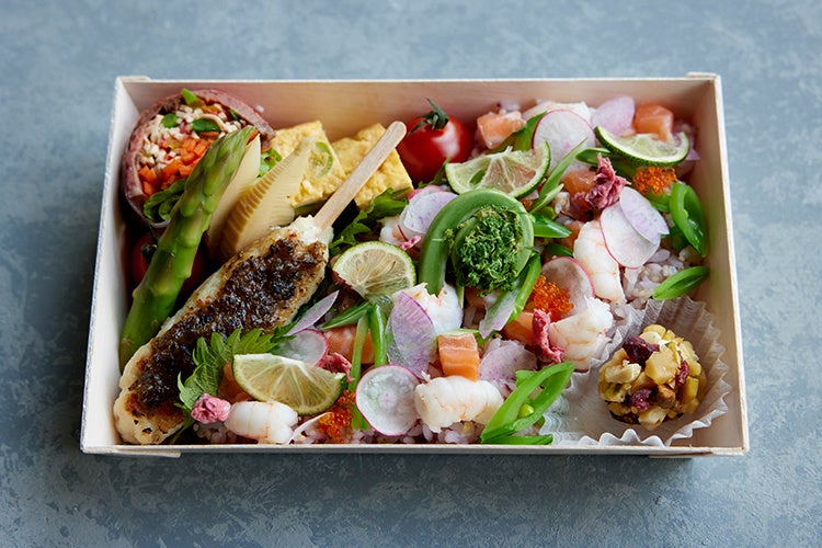 8種の雑穀入りの酢飯に、エビ、サーモン、スナップエンドウ、コゴミ、ラディッシュ、桜の塩漬けなどを彩りよく散らしました。サイドには、豆腐つくねの蕗味噌焼き、ソラマメの出汁巻卵、ガンスーのナムルのローストビーフ巻きなどを添え、野菜もたっぷりお召し上がりいただけます。