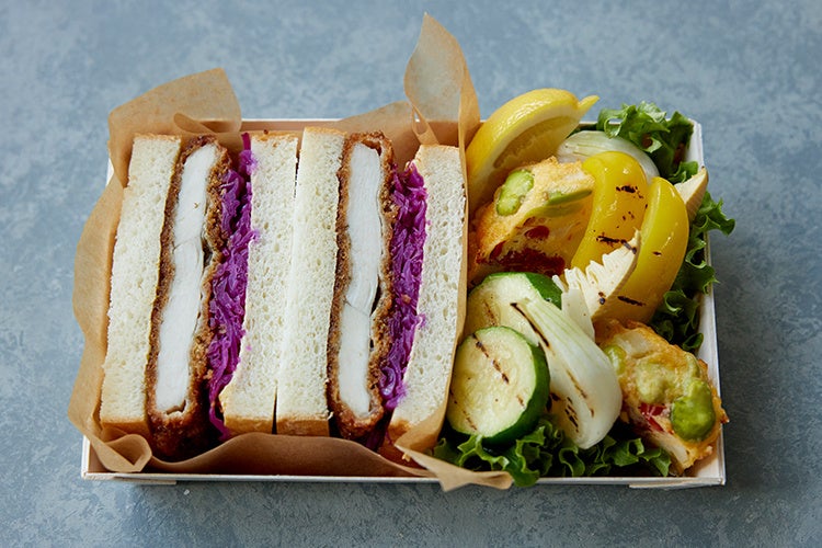 ベーカリーでも人気の「まいにちの食パン」に、衣にエルヴ ド プロヴァンスを加えた鶏むね肉のカツ、ハラペーニョをほんのりきかせた紫キャベツのソテーを挟んだ、ボリュミーなサンドイッチが主役。ソラマメとペコリーノのフリッタータ、新玉ネギやタケノコなど春野菜のグリルと一緒にどうぞ。