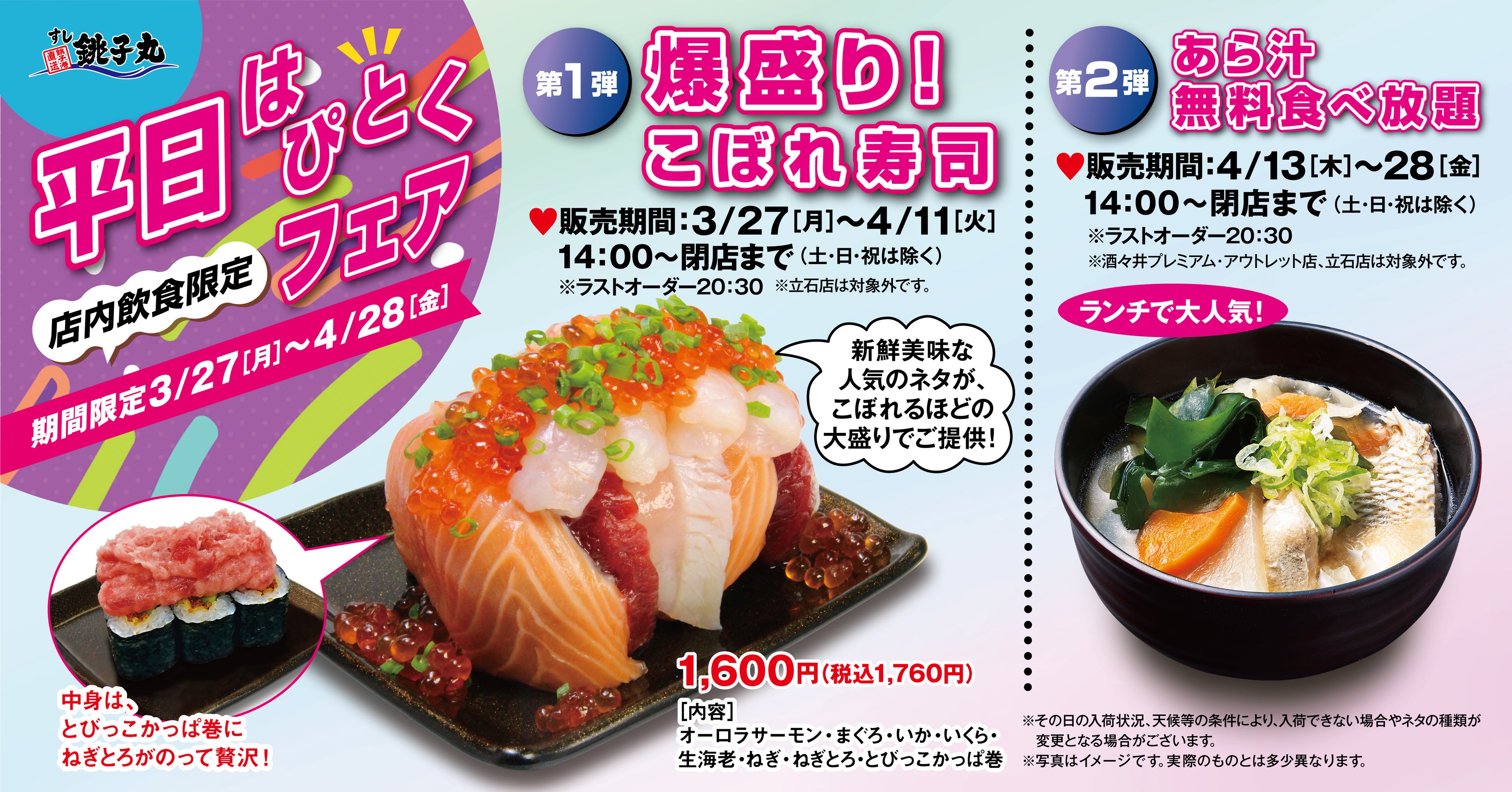 すし銚子丸は、新たな試みとして3月27日(月)~4月28日(金)までの期間中、平日限定で14時~閉店まで『平日はぴとくフェア』を開催いたします(店内飲食限定)。新鮮な鮮魚を毎日寿司職人が捌き、「新鮮・美味しい・価値ある寿司」をモットーにした“銚子丸らしさ”を大切にしつつ、登場のインパクトのある思わず撮影したくなる「爆盛り!こぼれ寿司」で楽しくハッピーに、ランチで大人気のあら汁を「あら汁無料食べ放題」でお得に提供いたします。この機会に是非、足をお運びください。