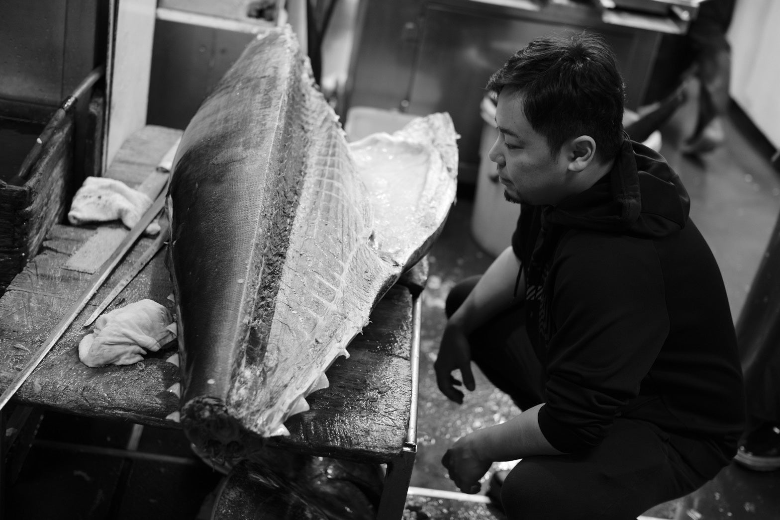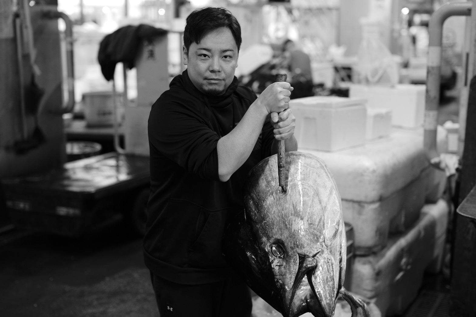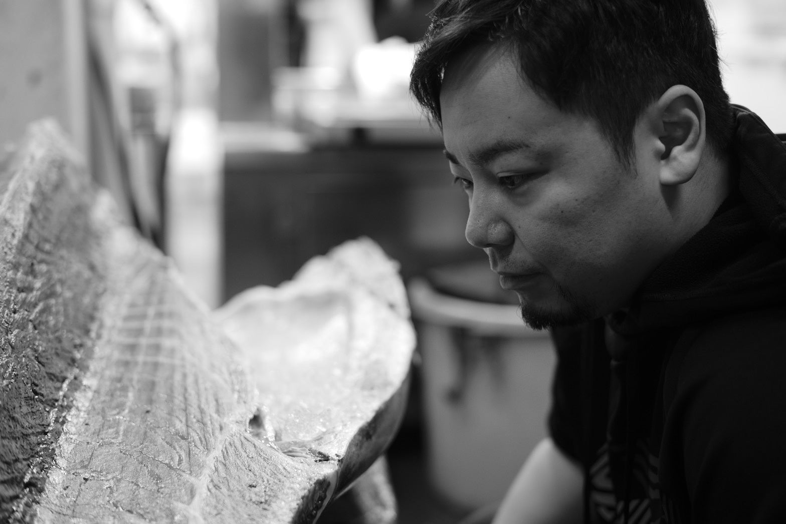 有楽町かきだ大将は更なる味のクオリティーの向上のため、仕入れ強化を行っている。今回も株式会社築地樋栄さんのご協力のもと下田産の生本マグロ(130kg)を買い付けることができた。