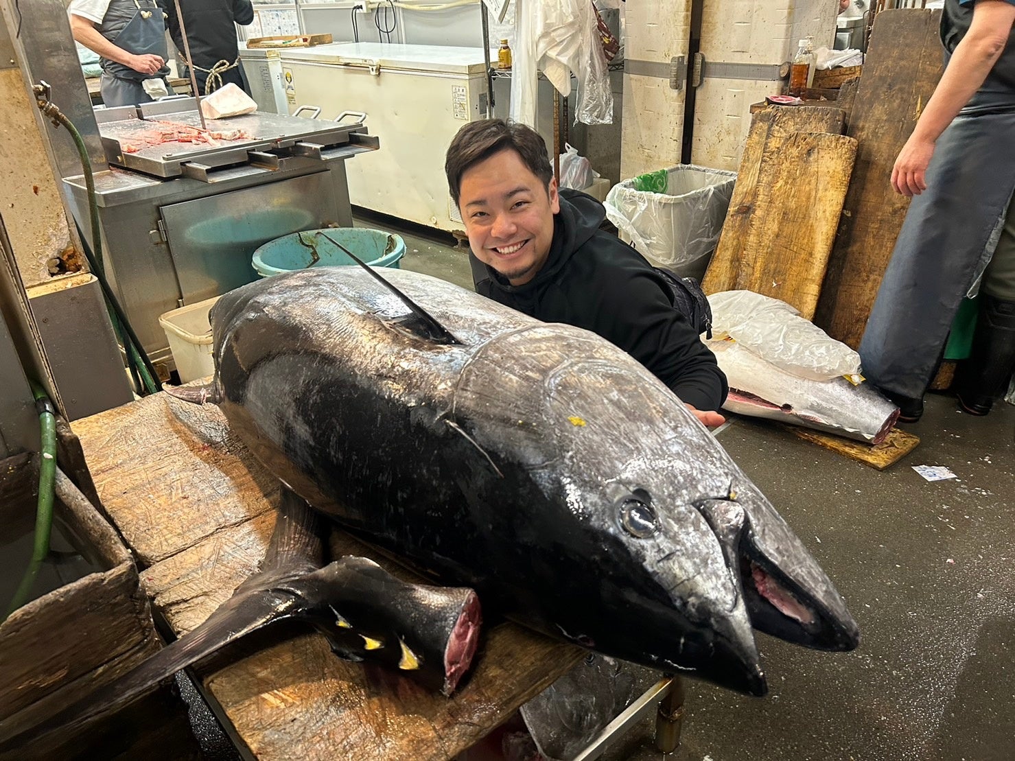 有楽町かきだ大将は更なる味のクオリティーの向上のため、仕入れ強化を行っている。今回も株式会社築地樋栄さんのご協力のもと下田産の生本マグロ(130kg)を買い付けることができた。