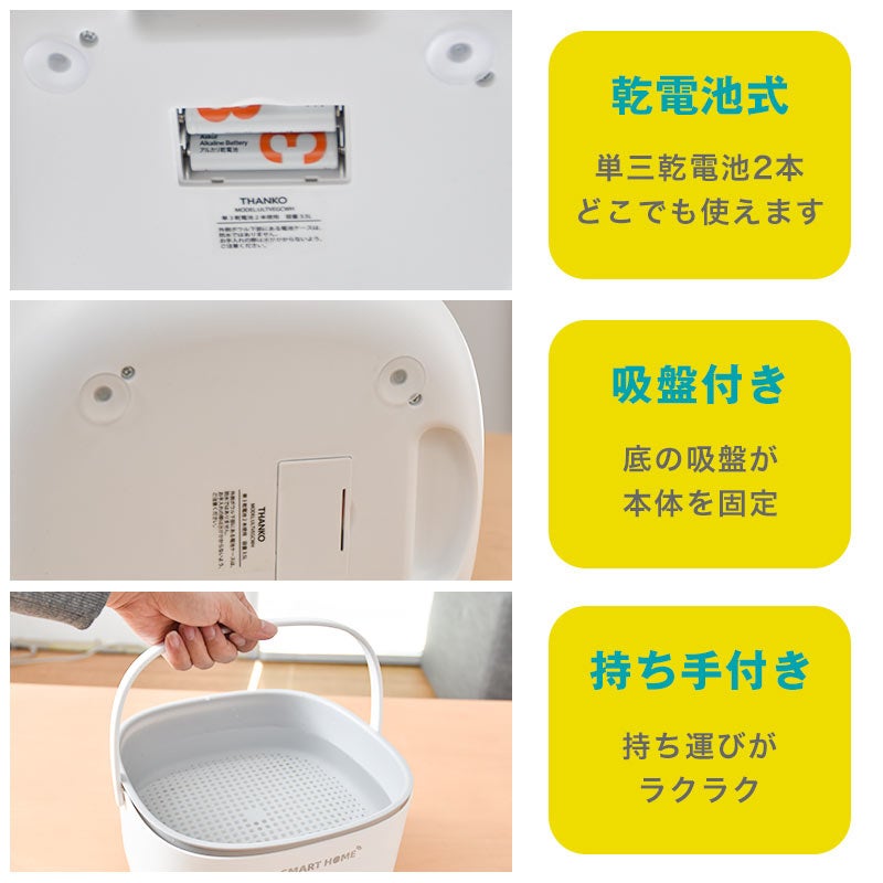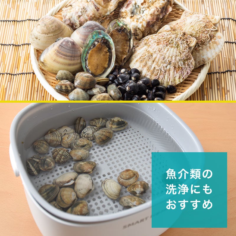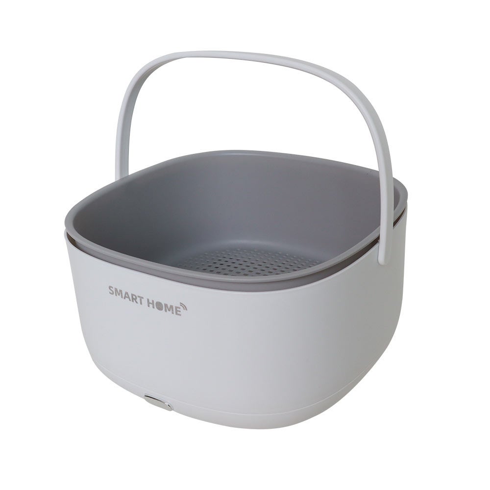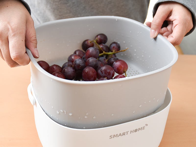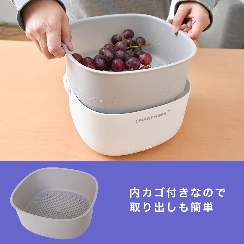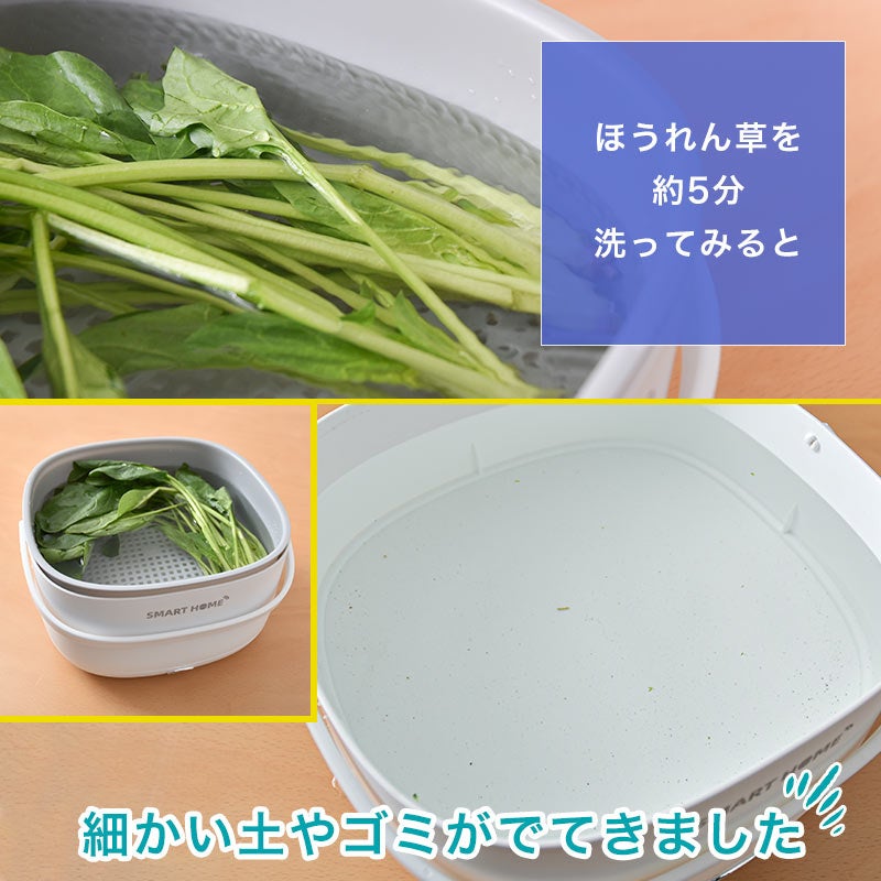 単三乾電池2本で動作。振動を発生する本体部と内カゴで構成。幅225×奥行225×高さ130mm、480g。最大3.5L。内カゴをセットした本体に水かぬるま湯(40度まで)を入れ、洗浄したい果物や野菜を入れます。本体前面下側にある電源ボタンを押せば振動がスタート。