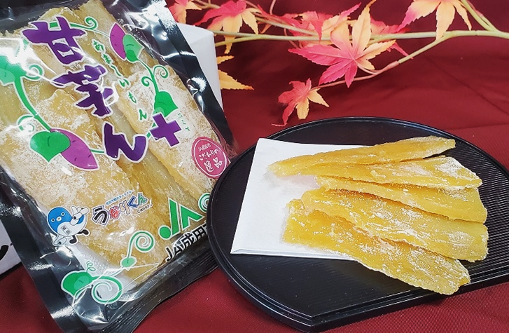 「甘芋ん」と「甘芋ん+」の2種類があり、それぞれさつまいもの種類を変え、1年中ほし芋をお楽しみいただけるように製造しています。「甘芋ん」は、「クイックスイート」を使用し、しっとりとした食感と甘さが特徴です。「甘芋ん+」は「べにはるか」を使用したほし芋で、柔らかくねっとりした食感と甘さを楽しめます。