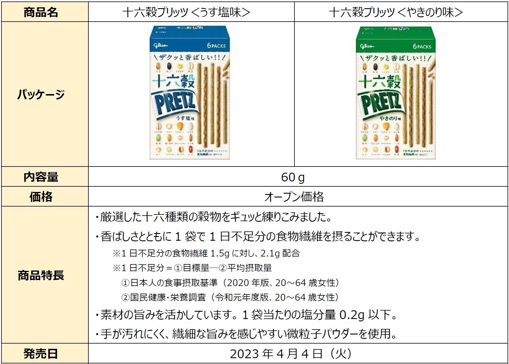 江崎グリコ株式会社は、じぶん時間を応援する「プリッツ」から、ザクっと食感と香ばしい味わいが特長の、おいしさと健康の両立にこだわった「十六穀プリッツ<うす塩味>」「十六穀プリッツ<やきのり味>」の2品を、2023年4月4日(火)より全国で発売します。