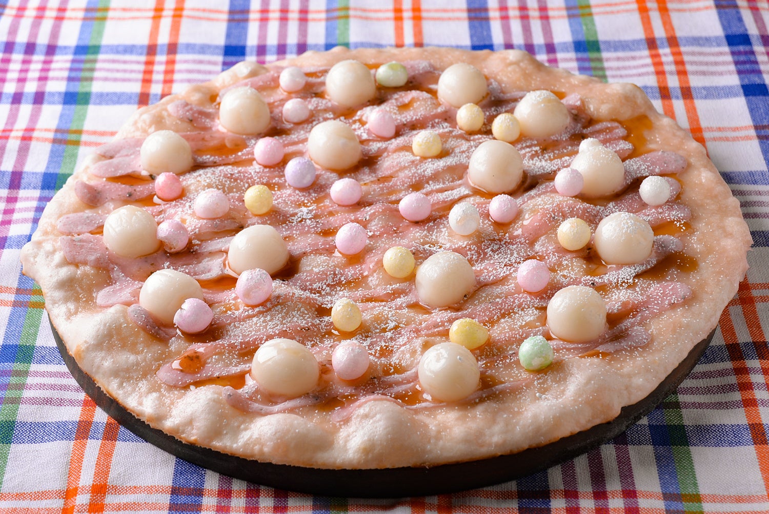 桜ペースト入りのソースに、丸いうさぎをイメージした白玉やカラフルなあられ「おいり」をトッピング。メイプルシロップで仕上げた見た目も楽しいデザートピザです。