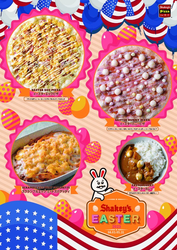 本企画では、マヨネーズとゴーダチーズの組み合わせにスクランブルエッグをトッピングした「イースターエッグピザ」、桜ペースト入りのソースに白玉やメイプルシロップでデザート風に仕上げた見た目でも楽しめる「イースターバニーピザ」の2種類のピザに加え、スクランブルエッグの下にミートスパゲッティが隠れた、お子様にも楽しんでいただける「スクランブルエッグミートスパゲッティ」、うずらの卵でイースターらしさを演出した「イースターカレー」、サラダバーの食材を自分の好みにカスタマイズして楽しめる「マイスタイルシーザーサラダ」の計5品をご用意しました。暖かくなりお出かけしやすいこの季節に、ご家族やご友人とシェーキーズでのイースターをぜひお楽しみください。