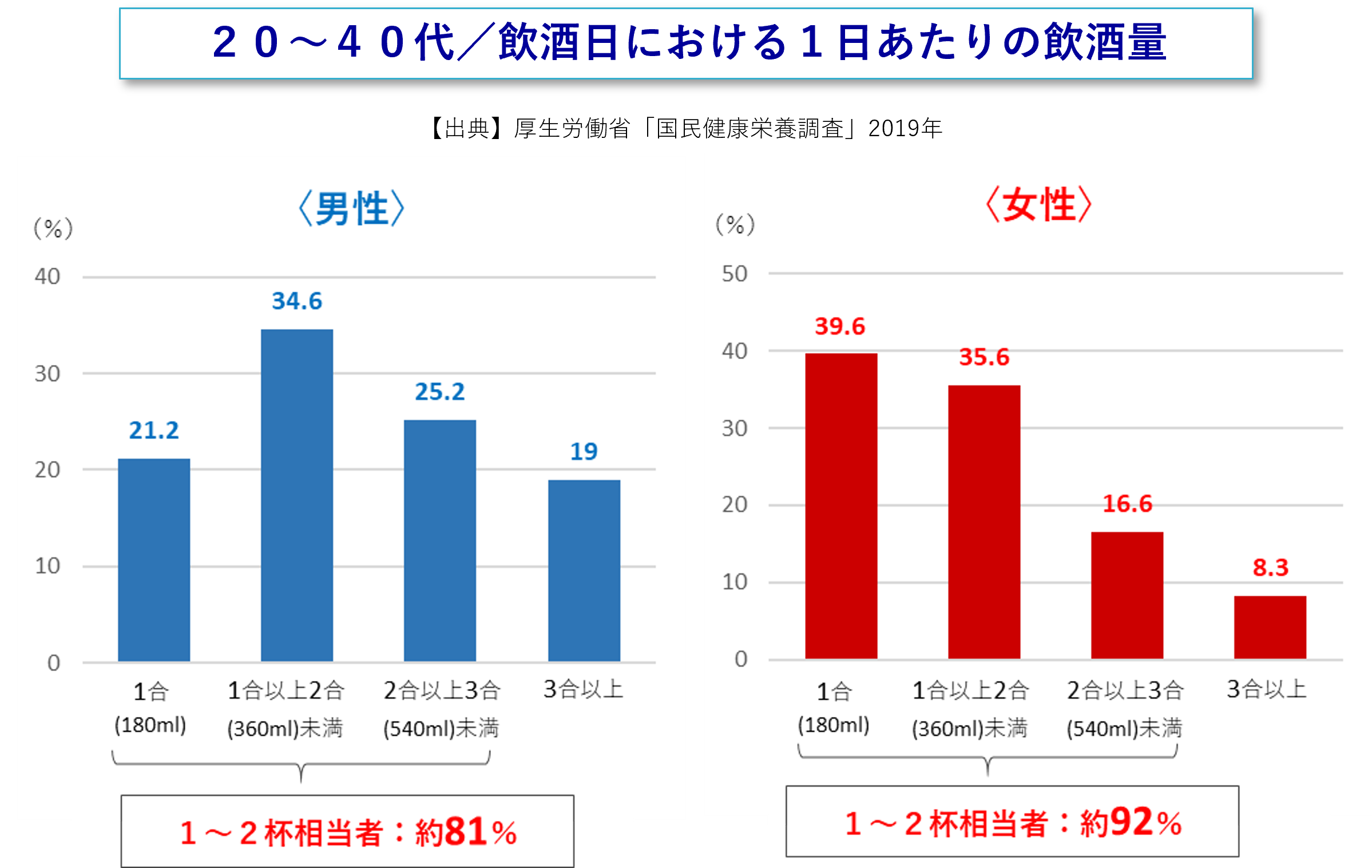 国酒とも呼ばれる日本酒市場は昭和48年度をピークに規模縮小に歯止めが掛からず、現在も苦戦を強いられています。(※1)特に40歳代以下のシェアが低く、次世代ユーザーの獲得が日本酒市場の大きな課題です。課題解決に向け味わいの追求や飲酒シーンの提案等に注力しておりましたが、厚生労働省「国民健康栄養調査」によると20~40代において1~2杯相当で飲酒を終える割合が非常に高く、飲酒の後半に飲まれる傾向が強い日本酒は、選択肢に挙がりにくい状況であることがわかりました。現在では定番となったチューハイやハイボールも、かつては消費者の原酒離れという現在の日本酒と同じ状況から、炭酸・低アルコール・食との相性の組み合わせにより客層・飲用シーンの拡大を果たしています。当商品も同様に1~2杯目に飲んでいただける新定番の日本酒として開発しました。