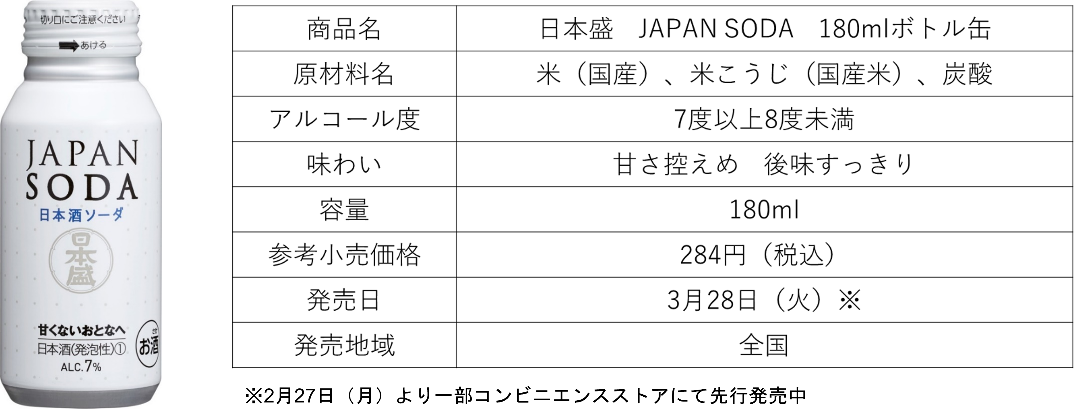 日本盛株式会社(本社:兵庫県西宮市、代表取締役社長:森本 太郎)は、「日本盛 JAPAN SODA 180mlボトル缶」を3月28日(火)に新発売いたします。当商品は日本酒ならではの華やかでフルーティな吟醸香を楽しめる、甘さ控えめで後味すっきりとした爽快な味わいです。日本酒好きの方はもちろん、日本酒飲用にハードルの高さを感じている方でも気軽に楽しんでいただけ、従来の日本酒では「合わない」とされていたこってりした食事にも合う発泡性の商品です。