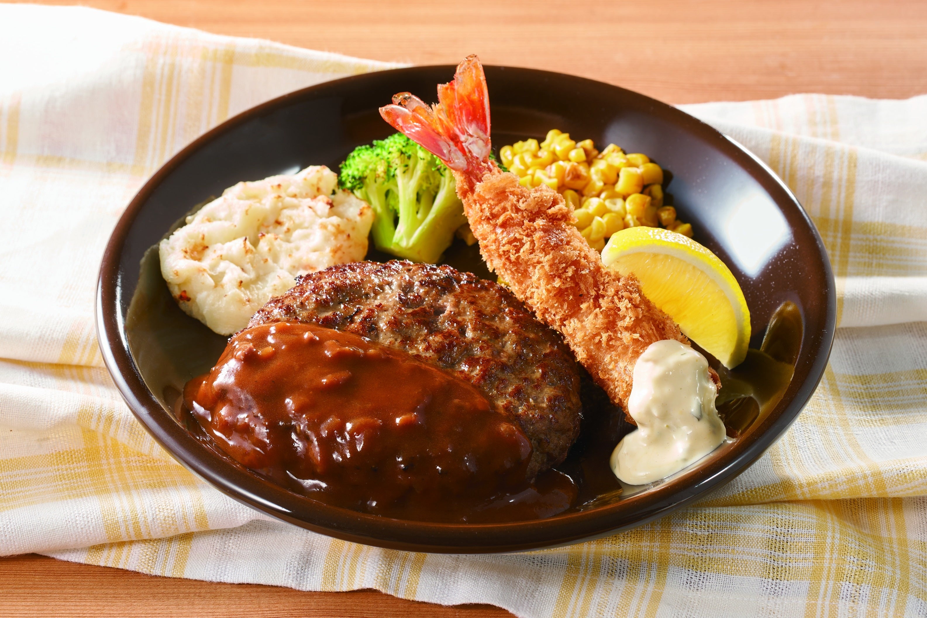 ふっくらと焼き上げたジューシーなハンバーグと海老フライでボリューム満点な最強タッグ。