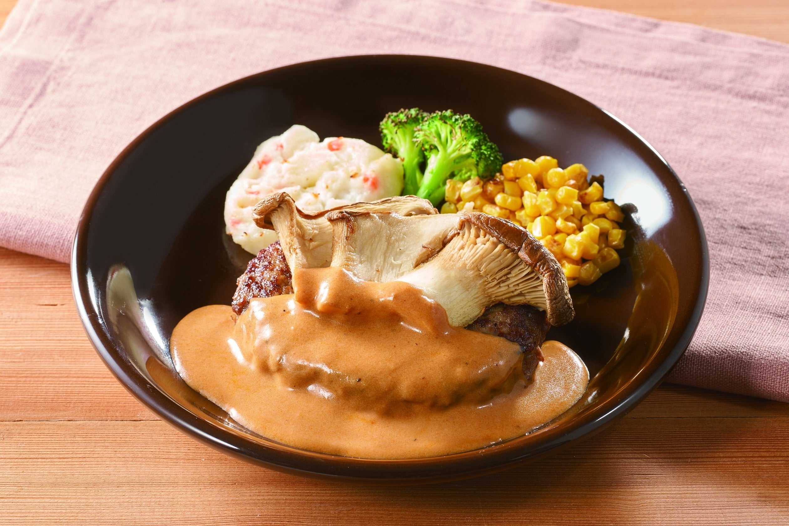 北海道産牛100%ハンバーグ 白神あわび茸のストロガノフソース